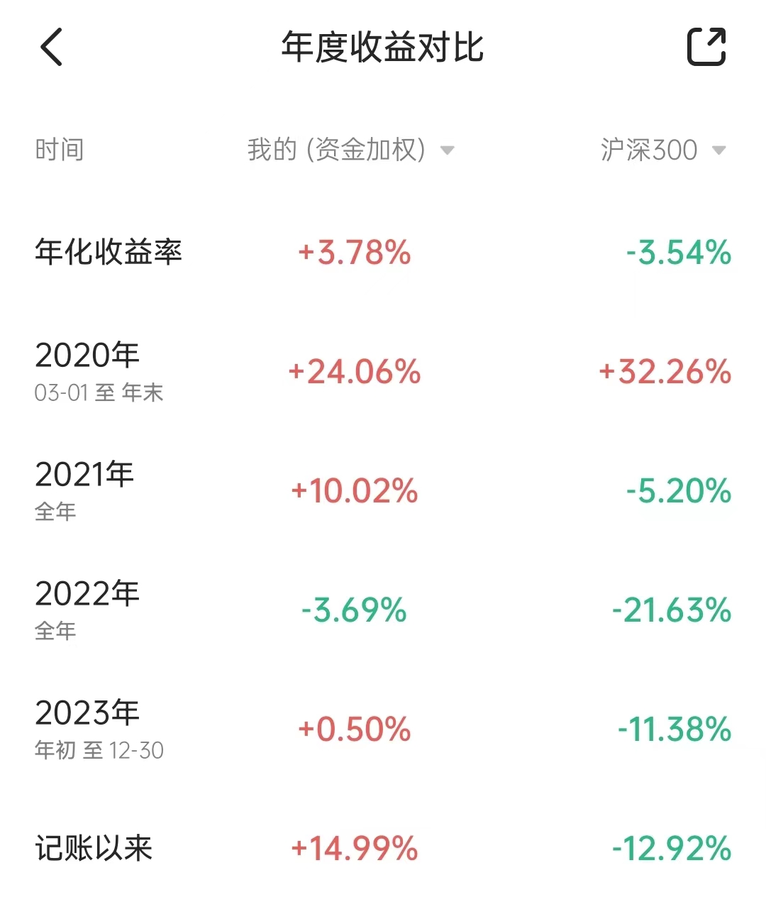 看收益率,今年玩了个寂寞,不是今年灵活资金的套利操作,今年大该收益率为大约-3%,对自己整体操作打分及格吧。2024年会怎么样?尽管看了各种预测,但是我相信这依然是不可预知的,我依旧会按照自己的体系设置投资,同样期望2024年取得好的收益,少犯错误,祝大家2024年收益长红!