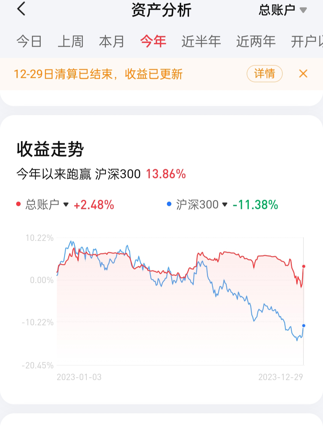 2023主要交易指基ETF,REIT基金和可转债。今年在可转债上没怎么深入研究,主要是做双低转债,做了段时间临期债,效果不好,基金操作上以上证指数ETF抄底多次都是盈利,但二季度重仓了REIT造成一次大亏,12月份指数跌到3000点以下,融资大仓位操作指基又造成了一次大回撤 ,融资对时机选择要求较高,仓位过大小小的波动就容易造成亏损,今年的收益目标没达成。