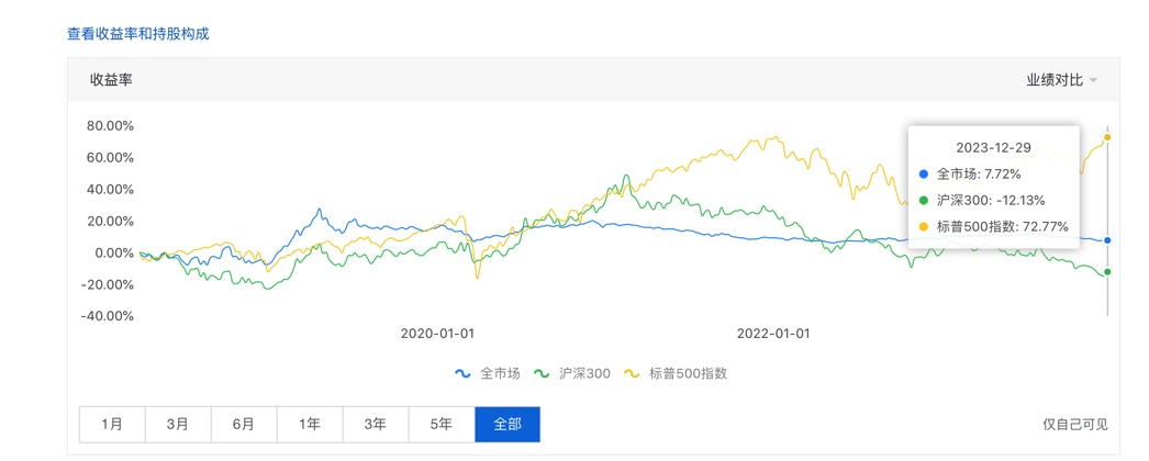 2023年投资回报率5.5%,相对于同期的沪深300年回报-11.38%来说算是跑赢,但如果对比美股标普500指数24%的年回报率来说,又显得极其寒酸,比上太不足比下略有余吧。