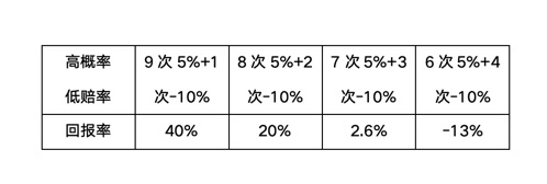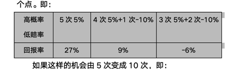 我看这个表想到的是:第一不能错,第二不能贪多。也可以说这是一种轮动,因为要把第一次取得的收益全部投在第二次、第三次乃至第五次。做10次全对的可能性当然有,但随着次数的增加必然增加了犯错的可能性(所以表内不列举10次全中的回报),因此,重点依然在于,每一次的高概率,即高确定性是重中之重。如果犯错,挨打认错及时卖出止损,寻找下一次机会,是不得不作出的逆人性选择,即机会成本和沉默成本的平衡。