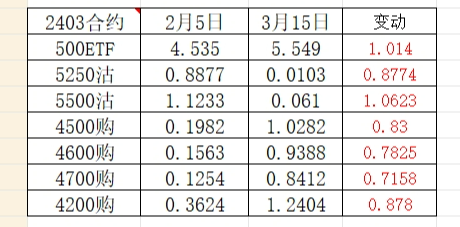 讲了N遍了,换买购买最深实!换买购买最深实!换买购买最深实!手数不变不代表DELTA不变!换的那个合约DELTA绝对值不能比原来那个小啊,换小了肯定亏了啊!方案二不如方案一,就是因为4700DELTA小于4500啊!2月5日明明有4200购,为什么要买4500和4700?最基本的教科书知识。我是没复盘,但直觉就觉得4200结果最好。4200方案:0.8877+0.3624=1.2501元,3月8...如果是现在复盘。那么2月5号最好的方式肯定是卖深实值沽。