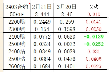 这张图显示了从2月21日冲高回落至今的部分期权价格表现。从事后看,股价真的陷入了调整,波动率持续下降,因此买入认购做多的收益肯定不如卖出认沽,这个结论无须过度讨论了。