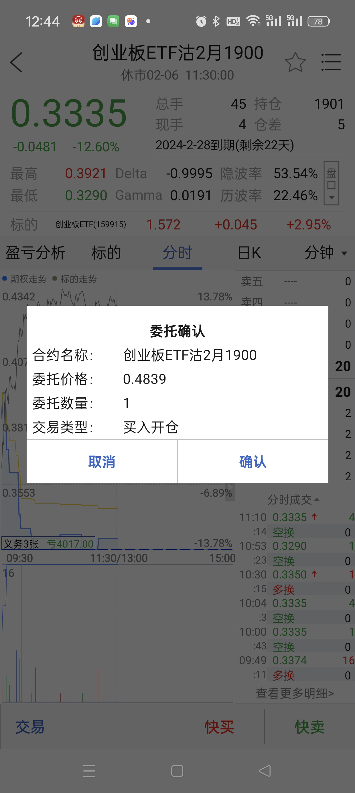 股价达到5.5元,卖沽是否上移不确定,假设放弃,依旧解套了。买购市值0.9元,刚刚获利0.05元。