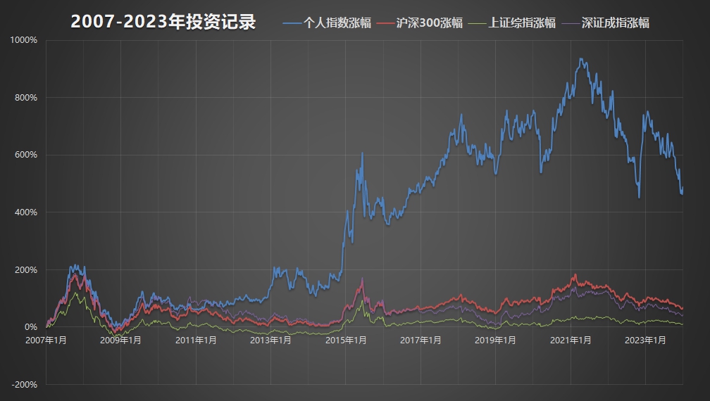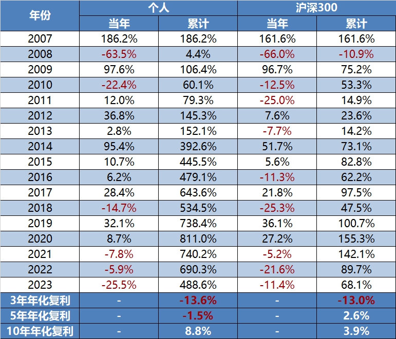 17个年头下来,我的累计收益率是+488.6%,年化复利约+11.0%,而同期沪深300累计+68.1%,年化复利约+3.1%,不含分红,会偏低估些。