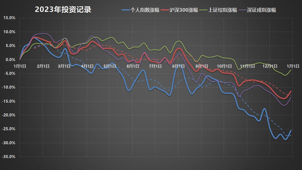 2023年的主基调是下跌,但其实截至8月的时候差点翻红,所以主要是下半年尤其第四季度跌得比较惨。我的全年投资收益是-25.5%。同期沪深300是-11.4%,上证综指-3.7%,深证成指-13.5%。