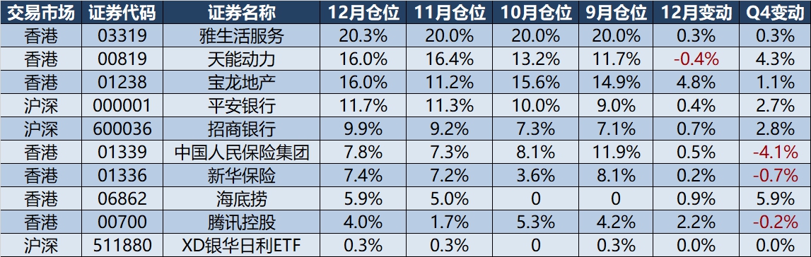 Q4主要增持:海底捞、天能动力、招商银行A股、平安银行、宝龙地产。