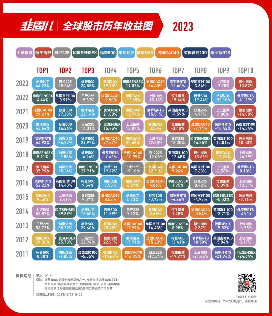 过去这十几年,上证指数、恒生指数,经常都是出现在后半区,而纳斯达克和标普500总是雄踞前半区。