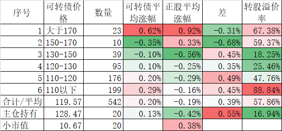 546只可转债平均上涨1.48%,对应正股平均上涨7.40%,可转债涨幅严重跟不上正股涨幅,不过这也正常,前期可转债的强烈的抗跌性使得溢价率上涨了很多,现在市场好了当然要还。当然有本事的能在市场底部切换正股更好,我是没这个能力只会傻傻的满仓轮动。
