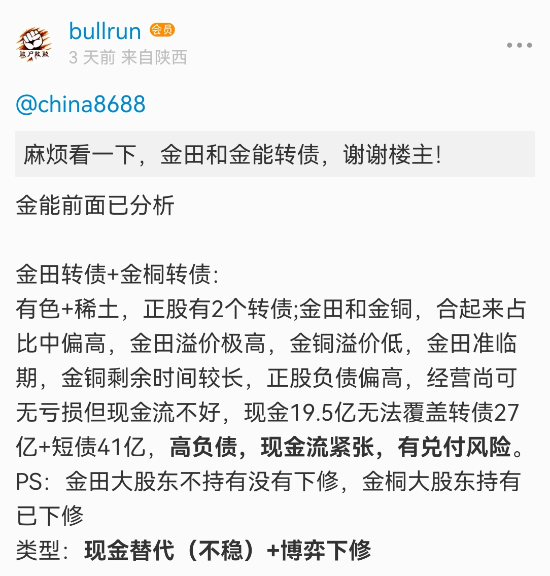 朋友给我的数据,可转债的机构持有占比最高好像是达到了40%,就是说机构是转债的定价权资金。转债的这轮下跌是机构撤退所致,我猜测机构撤退有两个决策依据:经营劣化导致的偿债风险、正股退市规则趋严的风险。岭南刚兑只是一堆偿债风险下的赔付个案,而且对大额打折,不足以消除机构疑虑。我倾向于认为,周一会有反弹,但高度有限,而且谈大势整体逆转尚早。
