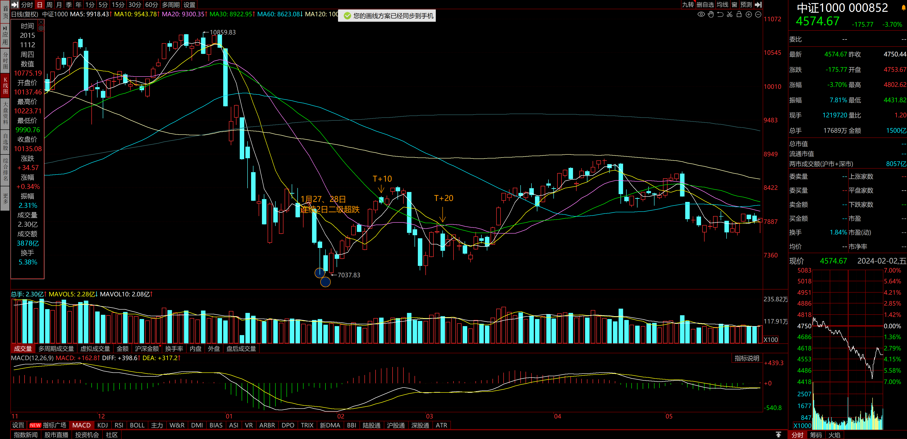中证1000反弹高点出现在T+12日,T+16日出现次低点,收盘未跌破28日低点。 - 24年1月31日、2月2日: