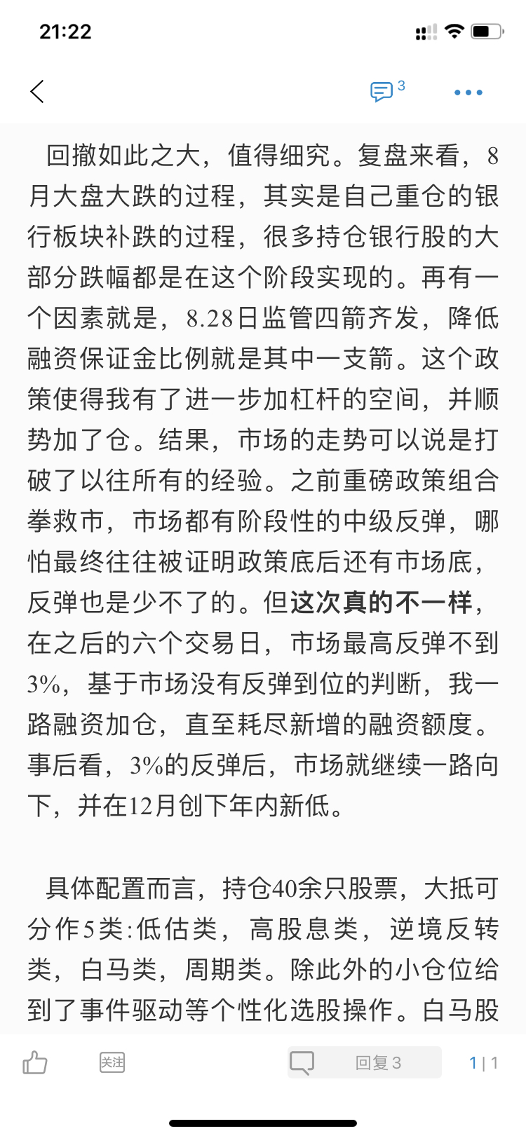 回撤如此之大,值得细究。复盘来看,8月大盘大跌的过程,其实是自己重仓的银行板块补跌的过程,很多持仓银行股的大部分跌幅都是在这个阶段实现的。再有一个因素就是,8.28日监管四箭齐发,降低融资保证金比例就是其中一支箭。这个政策使得我有了进一步加杠杆的空间,并顺势加了仓。结果,市场的走势可以说是打破了以往所有的经验。之前重磅政策组合拳救市,市场都有阶段性的中级反弹,哪怕最终往往被证明政策底后还有市场底,反弹也是少不了的。但这次真的不一样,在之后的六个交易日,市场最高反弹不到3%,基于市场没有反弹到位的判断,我一路融资加仓,直至耗尽新增的融资额度。事后看,3%的反弹后,市场就继续一路向下,并在12月创下年内新低。
