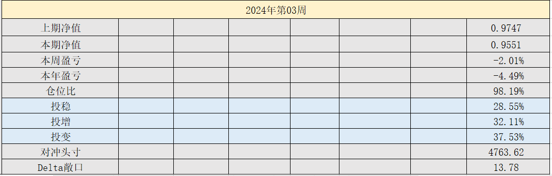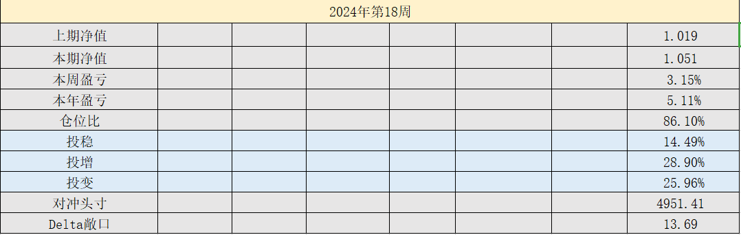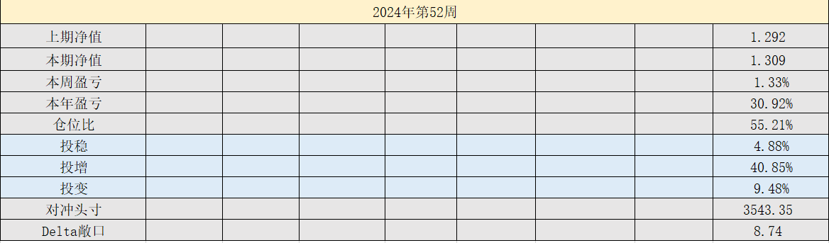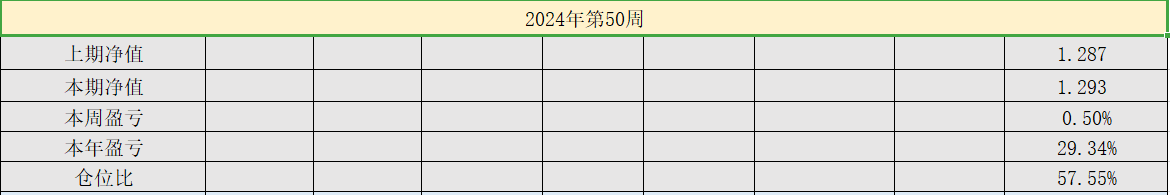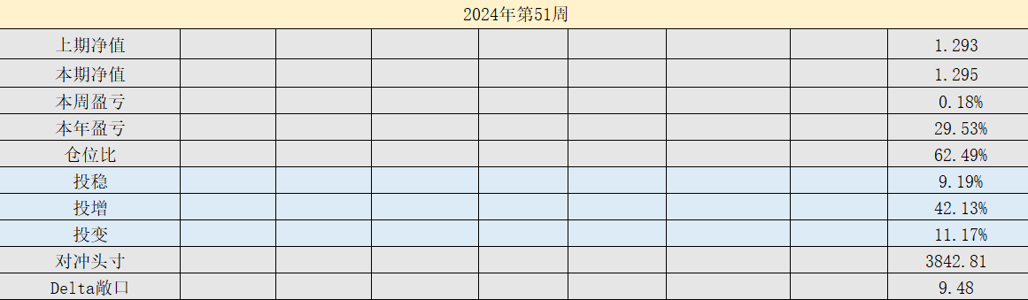 2024年51周,净值:1.295,本周盈亏:0.18%,本年盈亏:29.5%,总仓位:62%没有微盘,没有妖债,收益平平。
