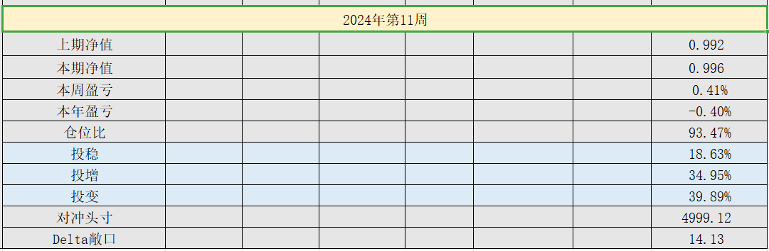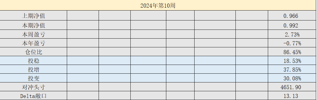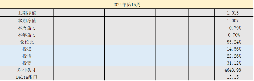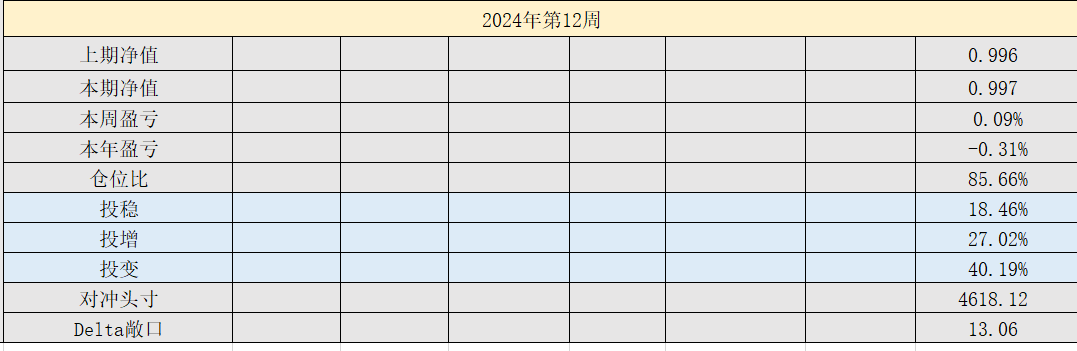2024年3月末,净值:0.997,本年盈亏:-0.31%,总仓位:85%