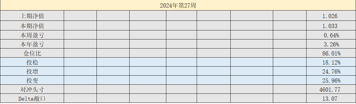 2024年7月末,净值:1.033,本年盈亏: 3.26%,总仓位:86%
