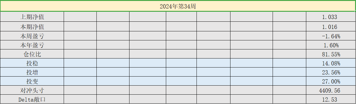 2024年8月末,净值:1.036,本年盈亏: 3.60%,总仓位:85%