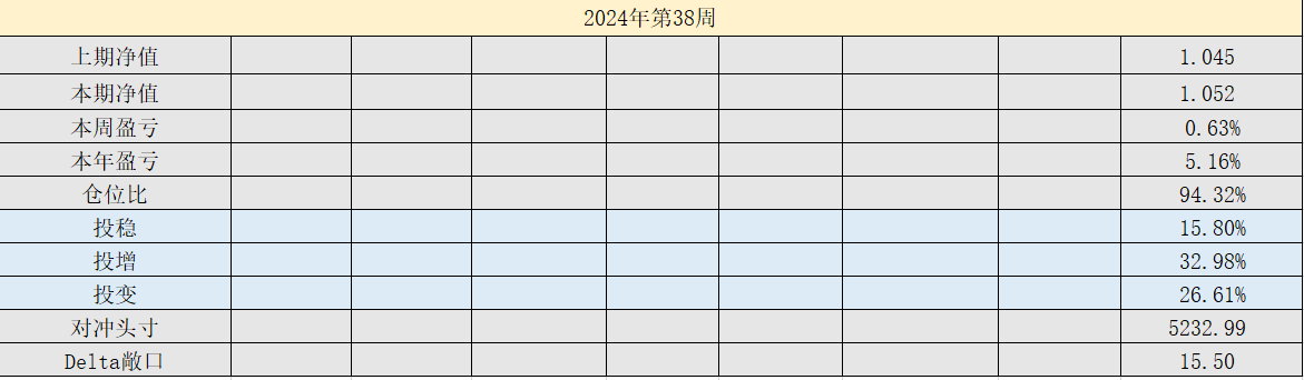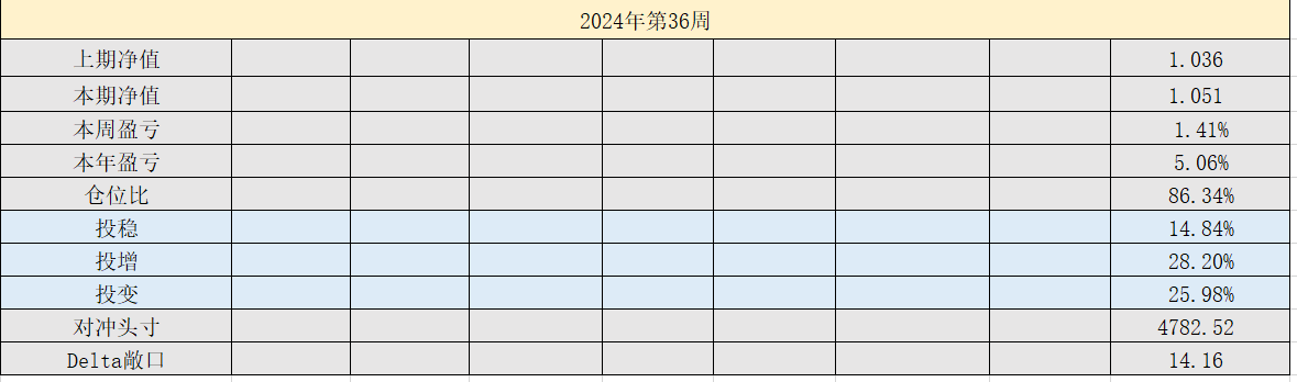 2024年36周,净值:1.051,本周盈亏:1.41,本年盈亏:5.0%,总仓位:86%上周五为大奇迹日,这周奇迹没了。两只套利债皆小胜清仓,以前每赚10个铜板落袋一次,现在1个就得落袋,这就是自我进化,不得不进化。我也想格局,但是总有人提前扣动扳机。这种局面让我想到了黑暗森林法则,现在的A股多么像黑暗森林啊,小心翼翼地等待对手犯错,真TM GO。