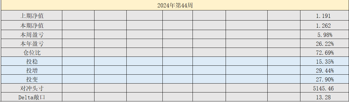 2024年10月末,净值:1.262,本年盈亏:26.2%,总仓位:72%