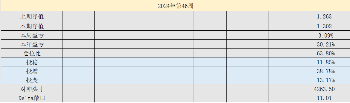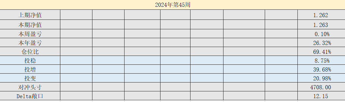 2024年45周,净值:1.263,本周盈亏:0.1%,本年盈亏:26.32%,总仓位:69%本周风格在中小盘,我的风格偏大盘一些,看着别人吃肉喝汤。上轮指数冲高,把手里的转债仓位全部清空了,基本逻辑是占比较高的问题债,如果在本轮不能完美实现化债,那么未来将会有第二轮考验,也就是低价债依然没有摆脱违约阴霾,整体水位收缩后,现在的价格和溢价都无法维持;只有少部分业绩良好,维持正现金流的转债,在正股联动下有些机会,掏兜游戏不参与,耐心等待下一轮埋伏机会。