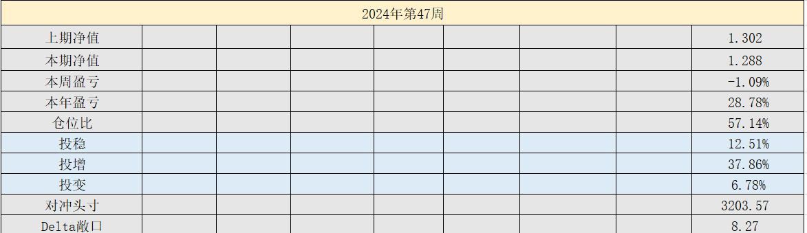 2024年11月末,净值:1.287,本年盈亏:28.7%,总仓位:61%