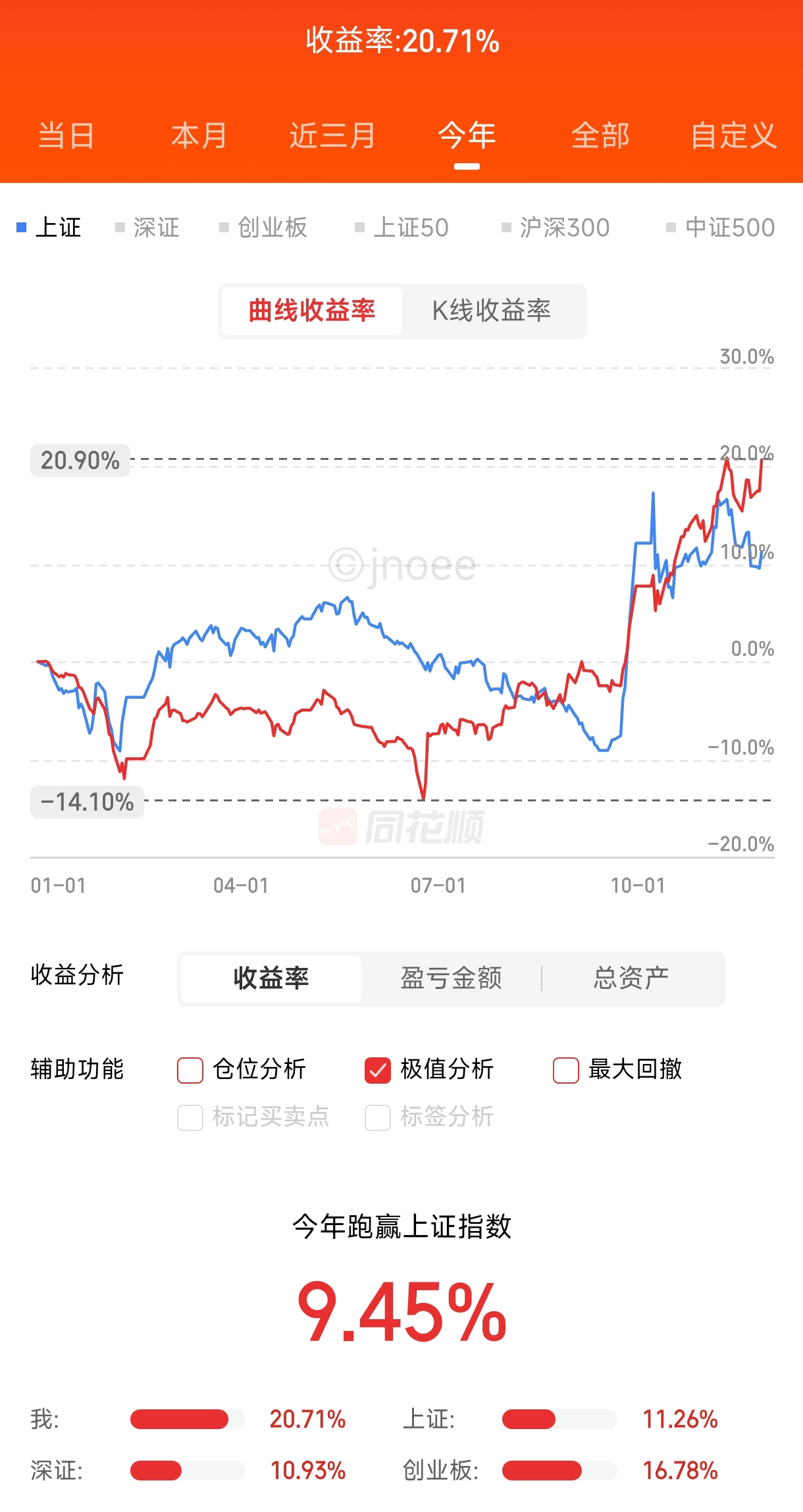 虽然今年的最大亏损也创了账户新高,但尚能接受,毕竟时间极短,并被迅速拉回。而对于盈利,却错过了太多机会。第一次是国庆前一个交易日的大减仓,一天之差使得整体收益少了大概3-4%,并且影响到后续一系列操作。这个操作堪比封基老师今年清仓可转债的重大失误,整体收益大致影响达到6%以上。第二次是熊市思维的拖累,在转债大幅反攻阶段过于保守,仓位不够,标的也太偏向防守,大大影响了收益。虽然之后开始移仓低溢价,但是时间有点晚并且依然畏畏缩缩,完全不匹配自己对牛市的坚信。第三次则是小盘债的投机机会,太过分散的标的和太过保守的止盈,使得错过了大量小盘债最肥美的那段利润。