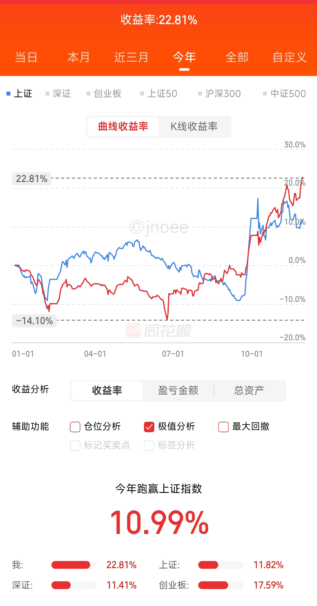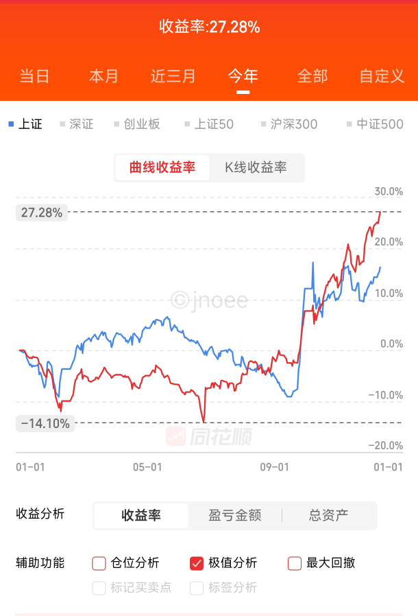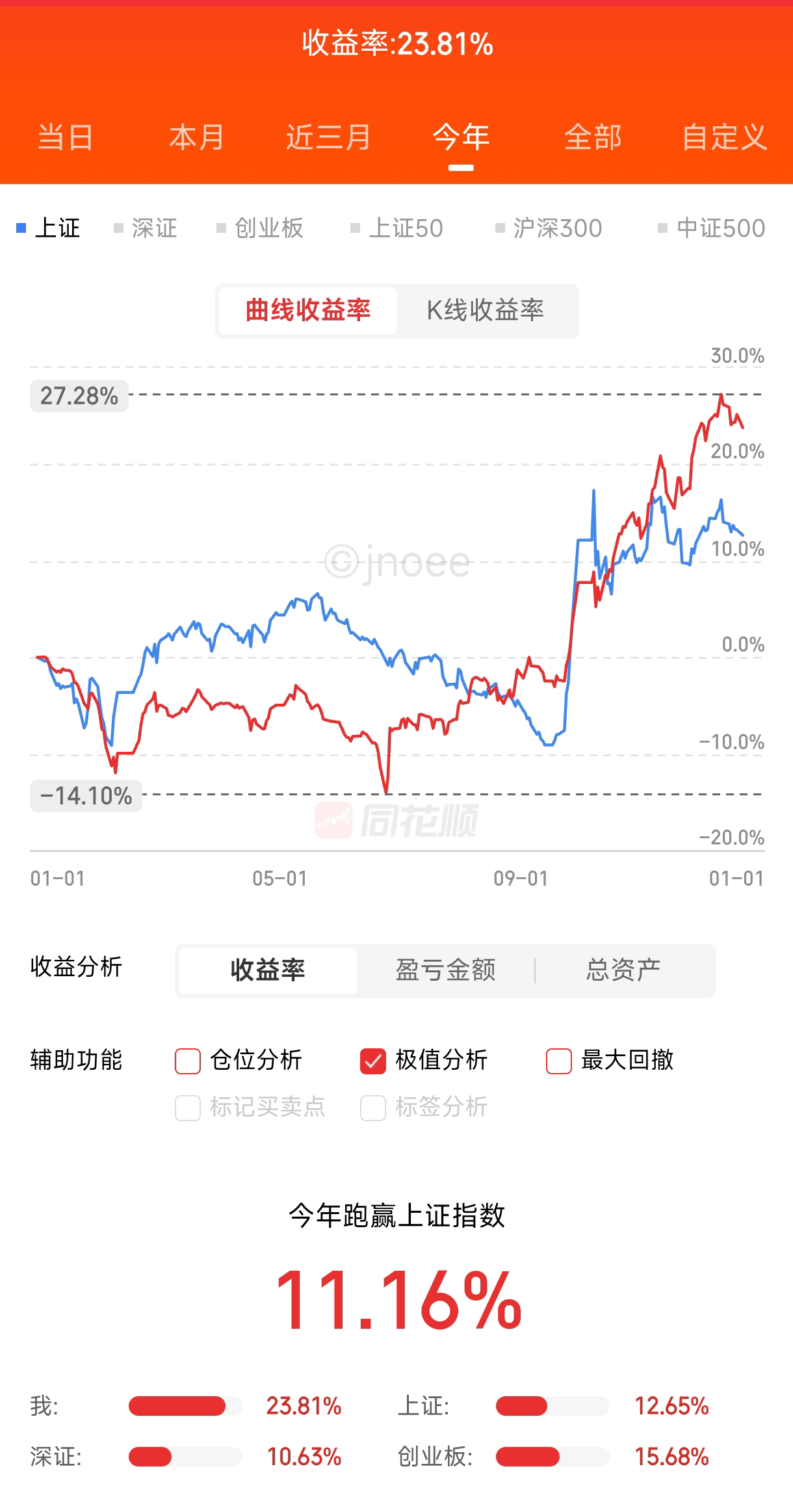 今年收益率23.53%,最高27.28%,最低-14.10%。从最大盈亏比来看,成绩并不合格,如果最大亏损能收敛在-10%以内或者收益达到40%以上,成绩才算勉强合格。
