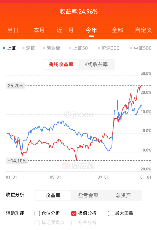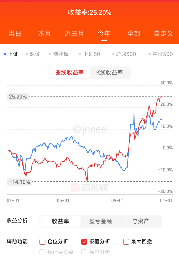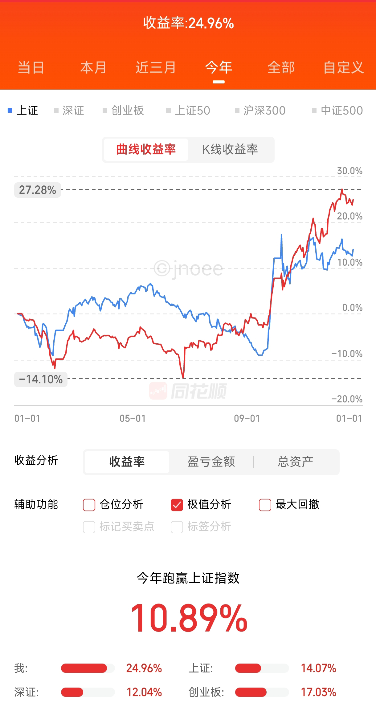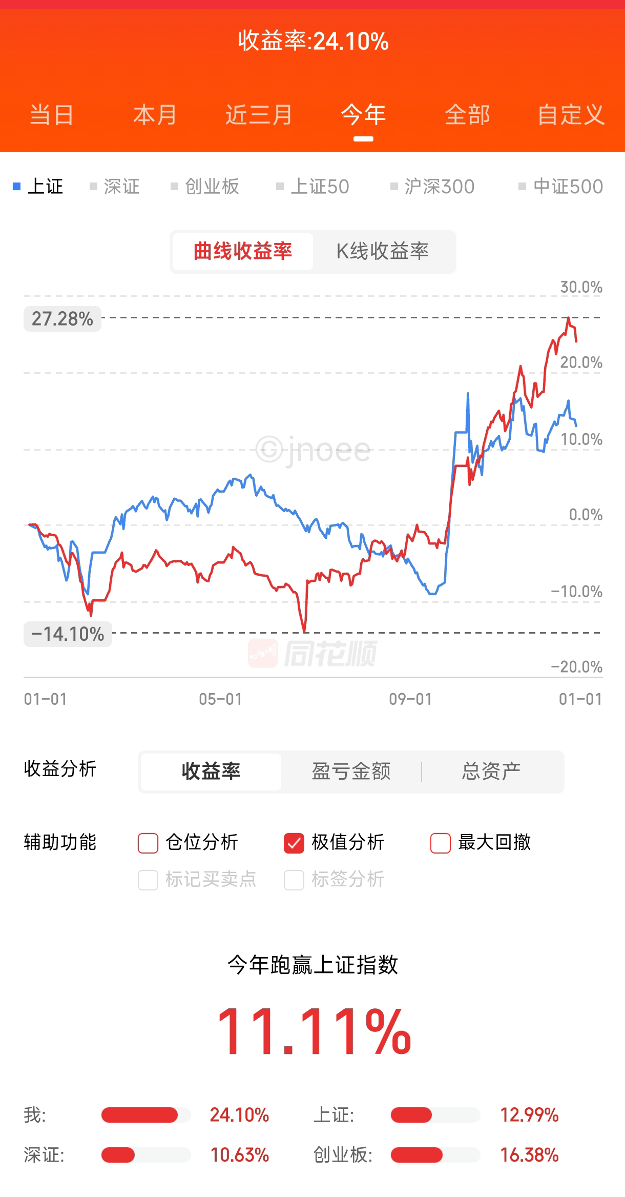 今年收益率23.53%,最高27.28%,最低-14.10%。从最大盈亏比来看,成绩并不合格,如果最大亏损能收敛在-10%以内或者收益达到40%以上,成绩才算勉强合格。