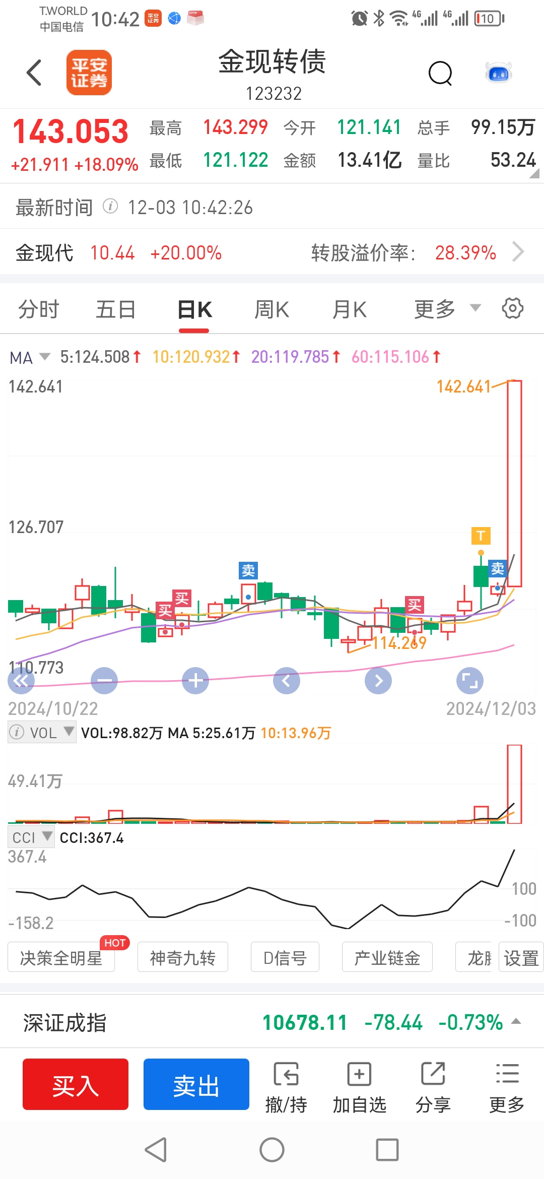 泰福:第二次买了,之前溢价率高了,被我低价割肉,谁知道又冲了起来,于是又买了回来,典型的花钱买溢价率。持仓还是亏钱的,买了就开始跌了。主要是正股带泵字,高看一眼。