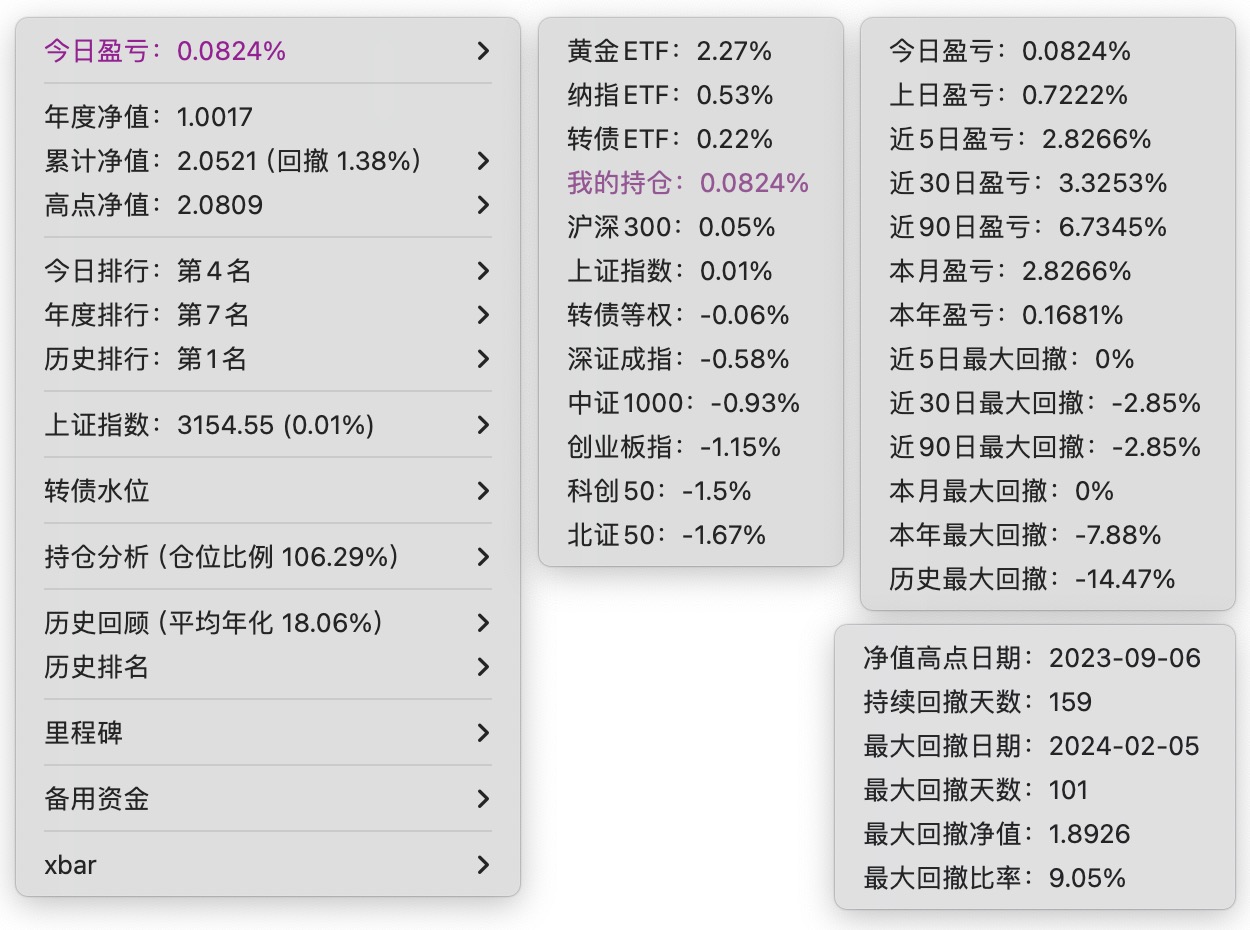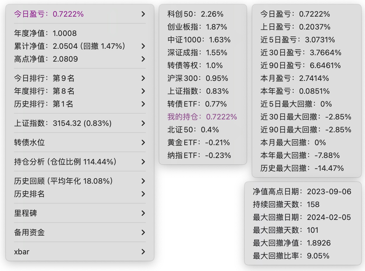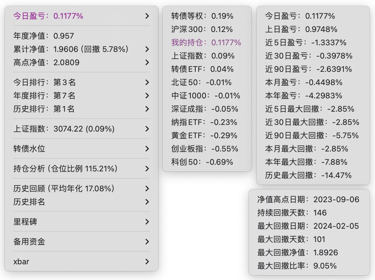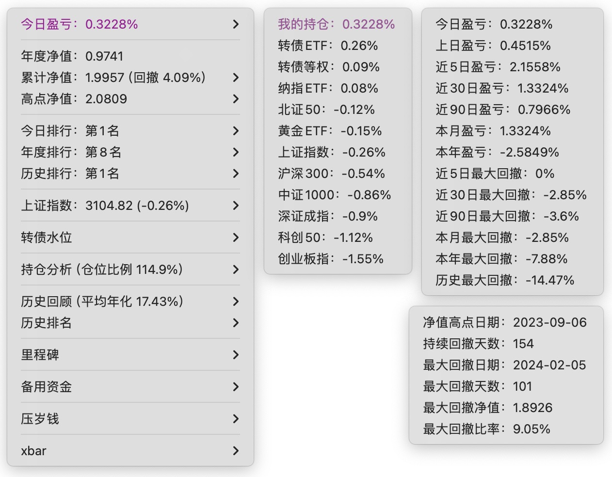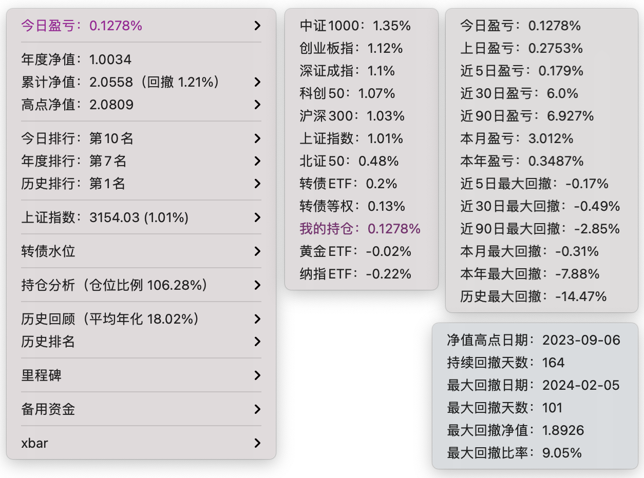 今日涨幅:0.2421%净值数据:1.0016(本年度),2.052(累计),高点回撤 -1.39%持仓数据:平均价格 108.1,平均溢价 75.4%,持仓数量:158市场数据:平均价格 121.636,平均溢价 65.6%,中位数价格 115.998(59.6%)市场成交:897亿清仓:富瀚(117.7)250张;减仓:英力(169.549)50张;建仓:富瀚(109.042)250张;加仓...楼主打地鼠的水平很高,是怎么做到的。