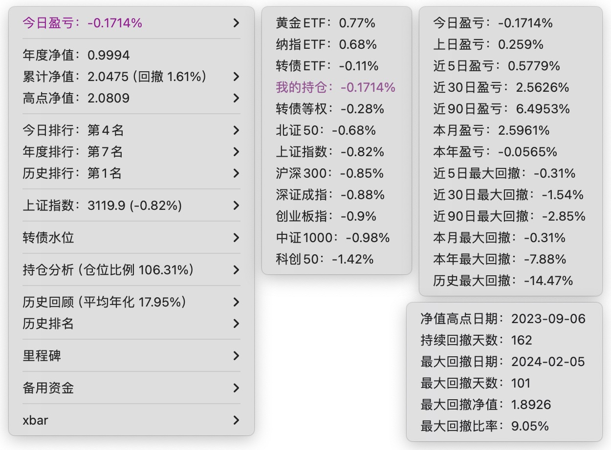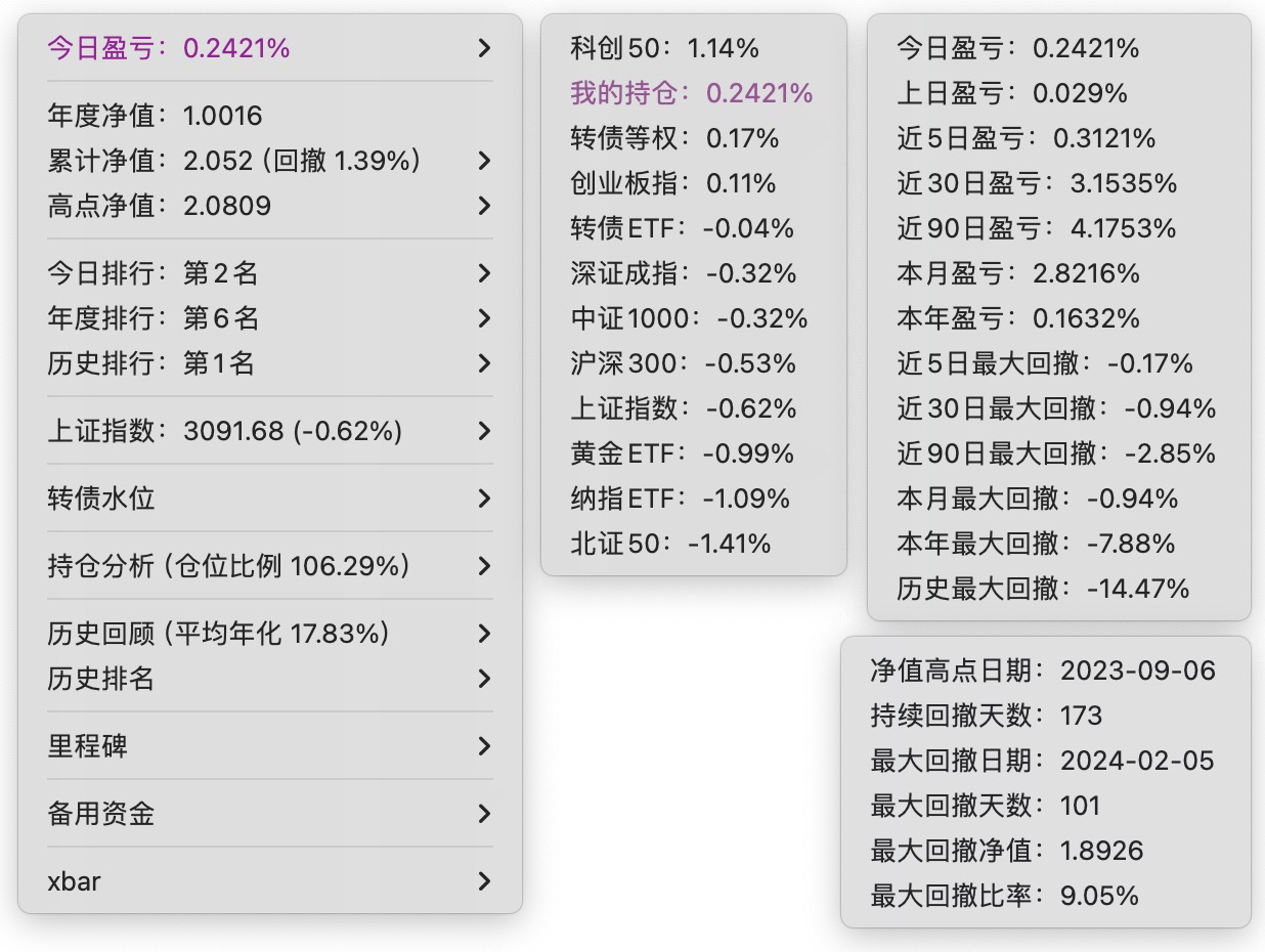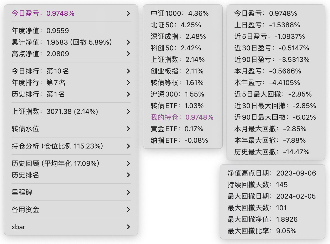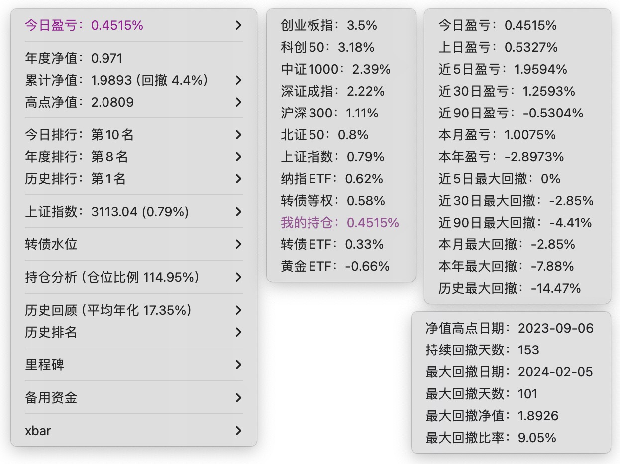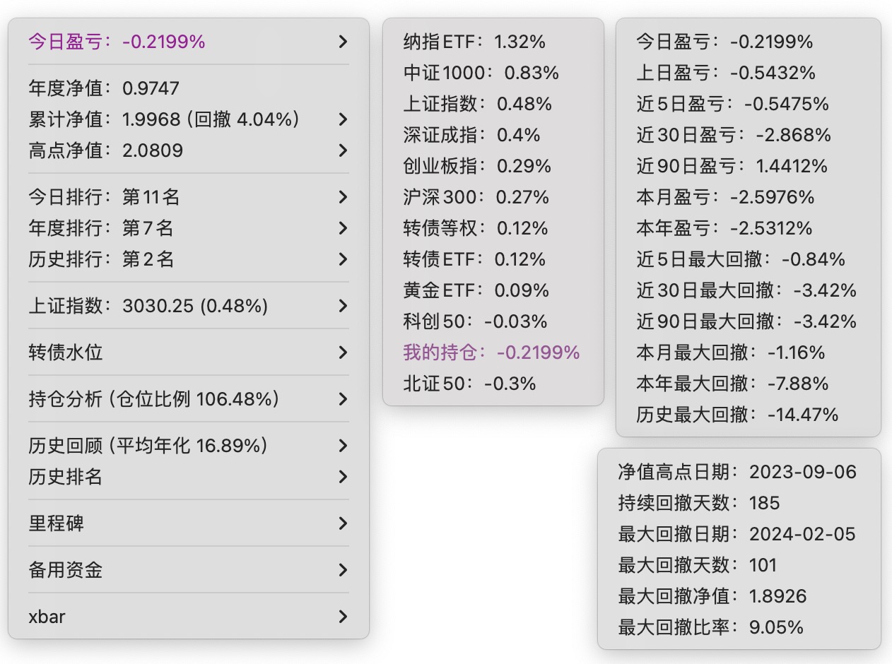 今日涨幅:0.2421%净值数据:1.0016(本年度),2.052(累计),高点回撤 -1.39%持仓数据:平均价格 108.1,平均溢价 75.4%,持仓数量:158市场数据:平均价格 121.636,平均溢价 65.6%,中位数价格 115.998(59.6%)市场成交:897亿清仓:富瀚(117.7)250张;减仓:英力(169.549)50张;建仓:富瀚(109.042)250张;加仓...楼主打地鼠的水平很高,是怎么做到的。