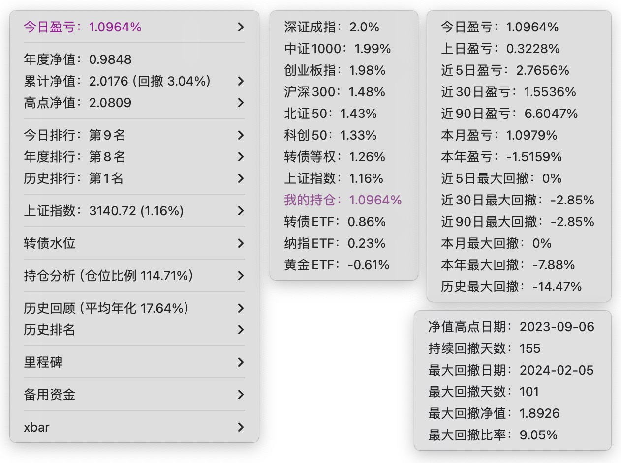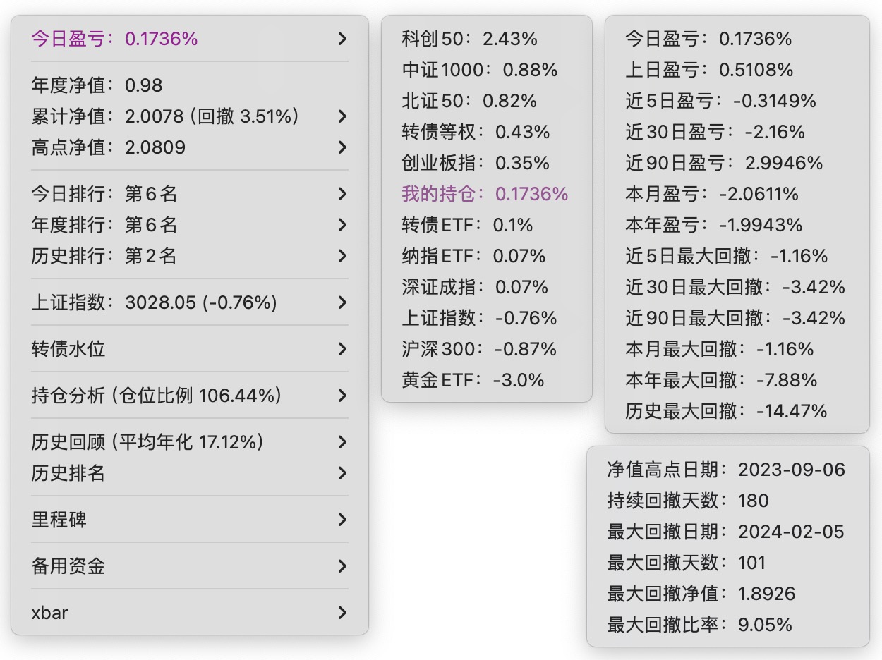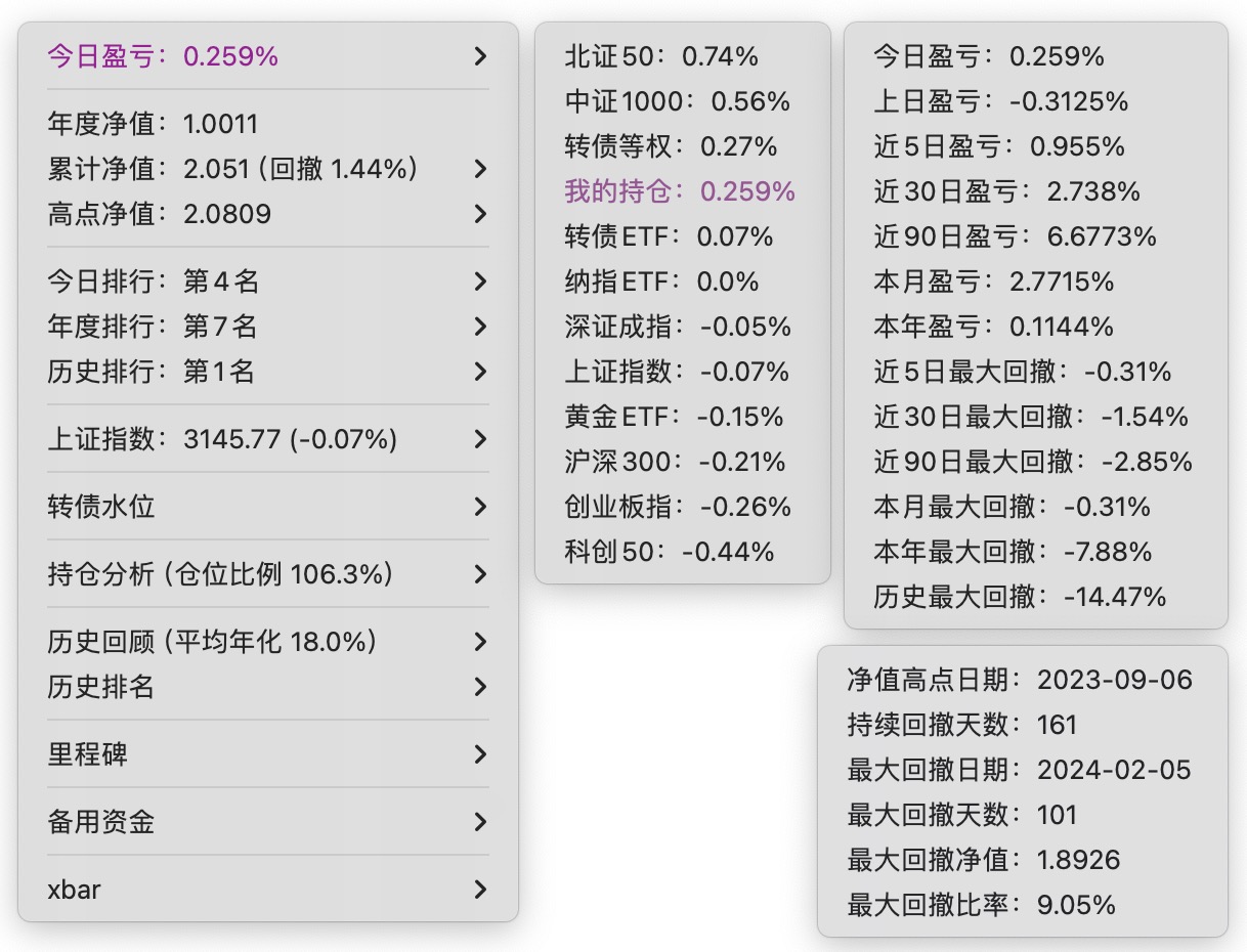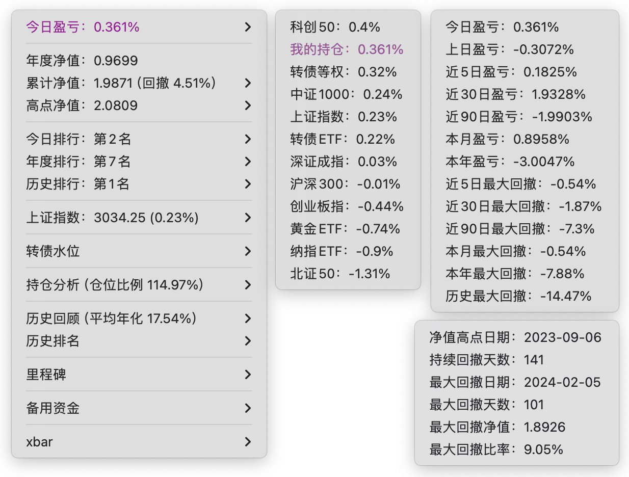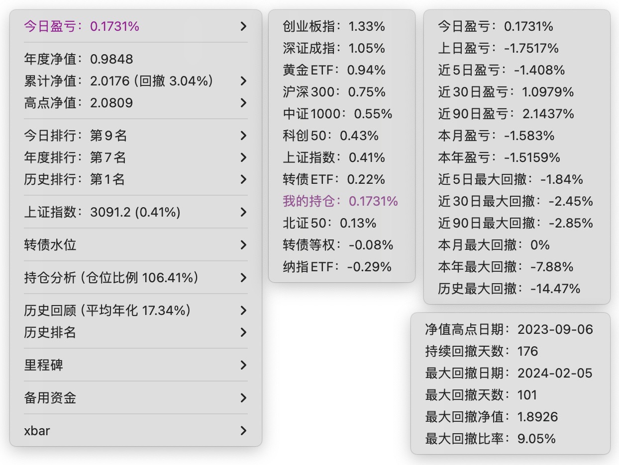 今日涨幅:0.2421%净值数据:1.0016(本年度),2.052(累计),高点回撤 -1.39%持仓数据:平均价格 108.1,平均溢价 75.4%,持仓数量:158市场数据:平均价格 121.636,平均溢价 65.6%,中位数价格 115.998(59.6%)市场成交:897亿清仓:富瀚(117.7)250张;减仓:英力(169.549)50张;建仓:富瀚(109.042)250张;加仓...楼主打地鼠的水平很高,是怎么做到的。