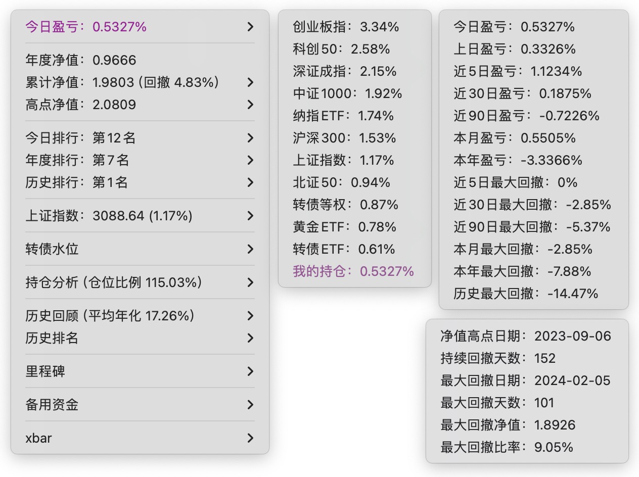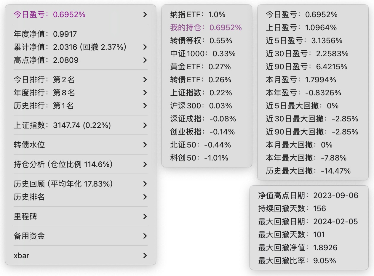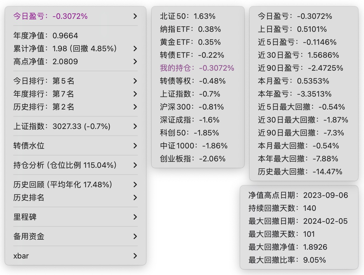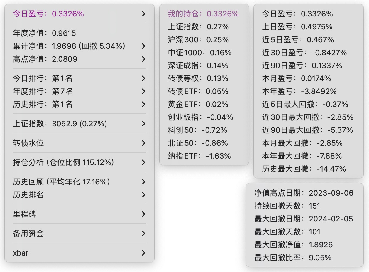 今日涨幅:0.2421%净值数据:1.0016(本年度),2.052(累计),高点回撤 -1.39%持仓数据:平均价格 108.1,平均溢价 75.4%,持仓数量:158市场数据:平均价格 121.636,平均溢价 65.6%,中位数价格 115.998(59.6%)市场成交:897亿清仓:富瀚(117.7)250张;减仓:英力(169.549)50张;建仓:富瀚(109.042)250张;加仓...楼主打地鼠的水平很高,是怎么做到的。