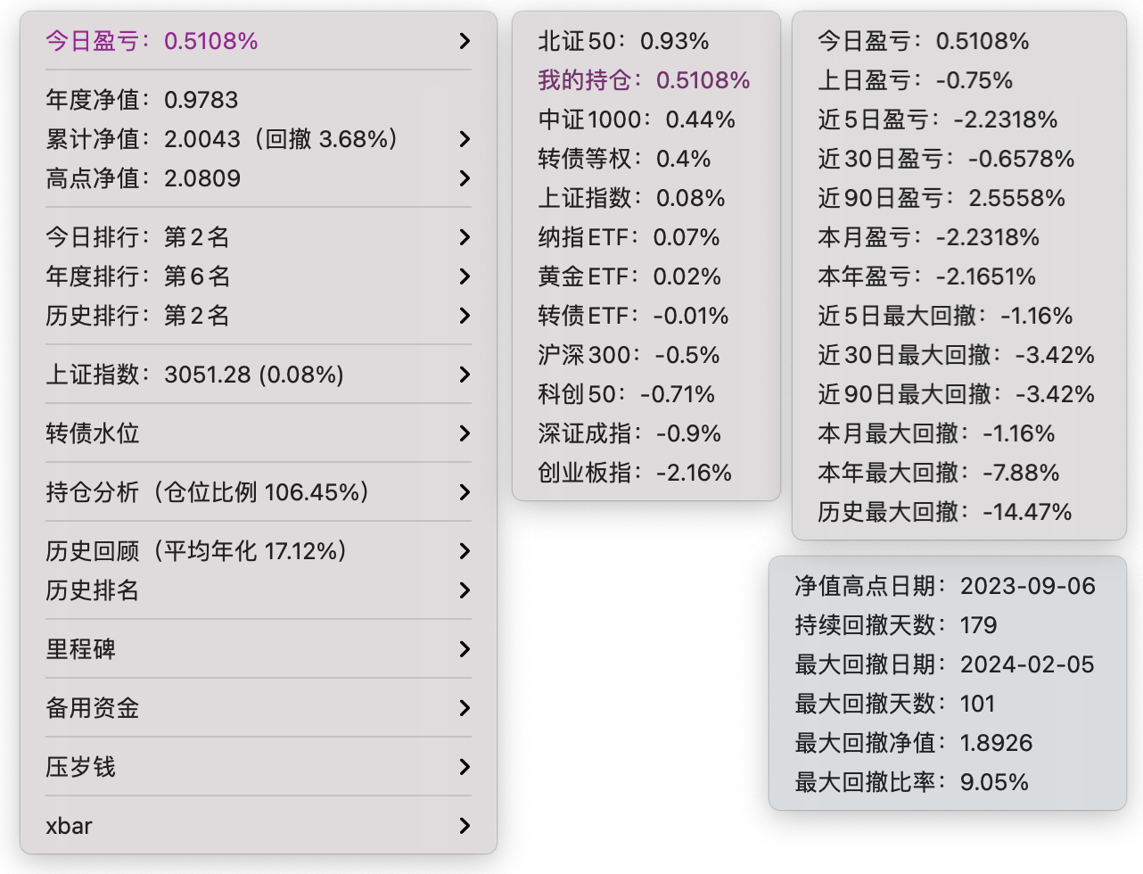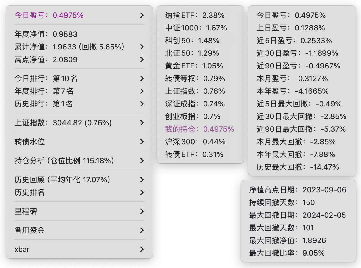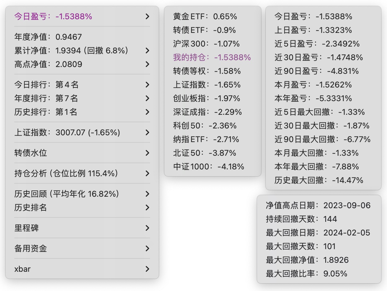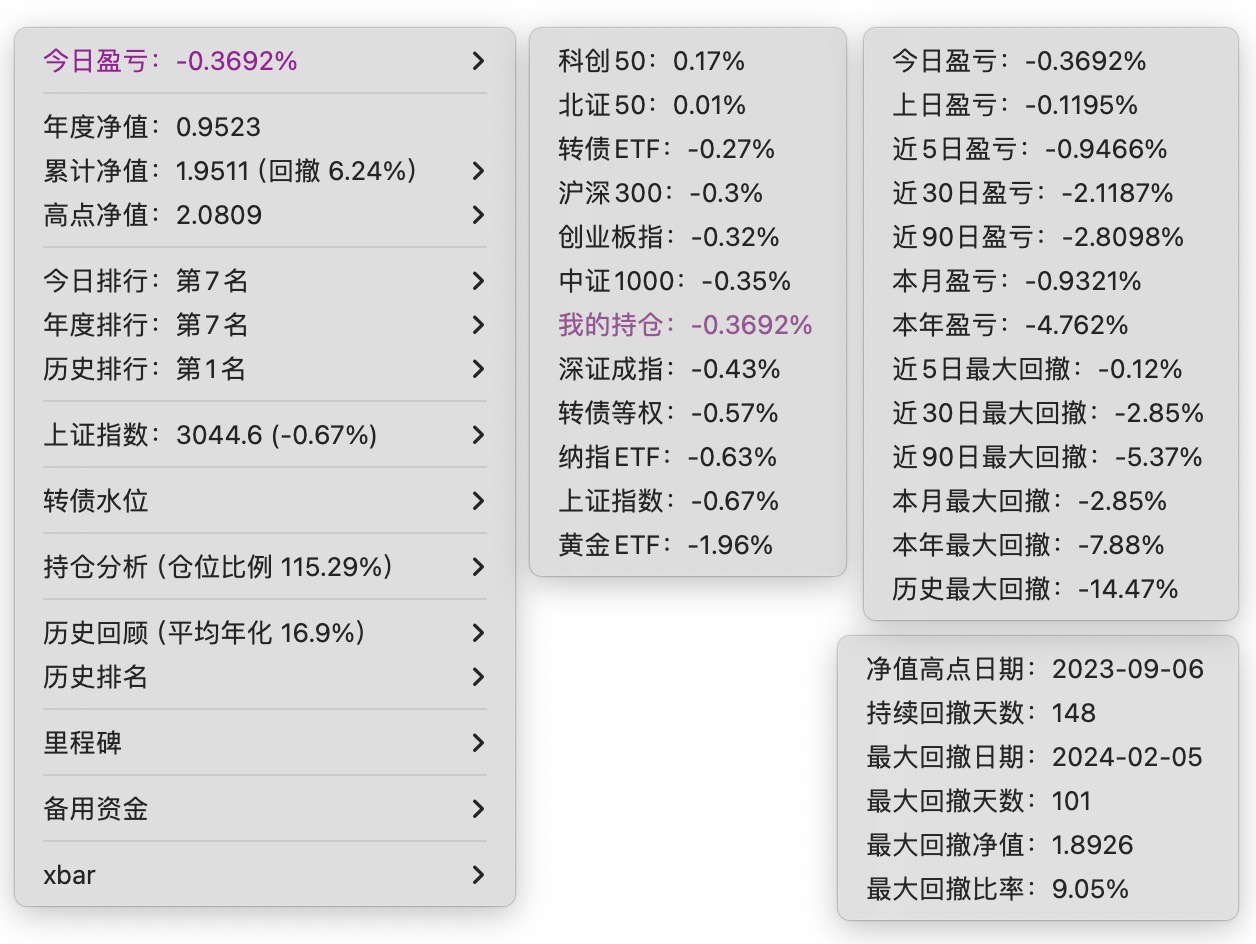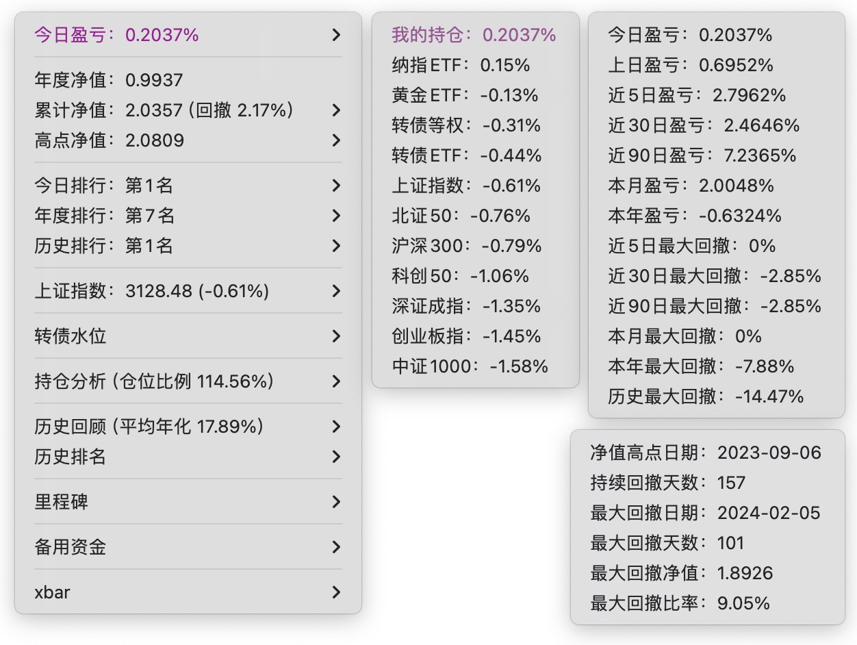今日涨幅:0.2421%净值数据:1.0016(本年度),2.052(累计),高点回撤 -1.39%持仓数据:平均价格 108.1,平均溢价 75.4%,持仓数量:158市场数据:平均价格 121.636,平均溢价 65.6%,中位数价格 115.998(59.6%)市场成交:897亿清仓:富瀚(117.7)250张;减仓:英力(169.549)50张;建仓:富瀚(109.042)250张;加仓...楼主打地鼠的水平很高,是怎么做到的。