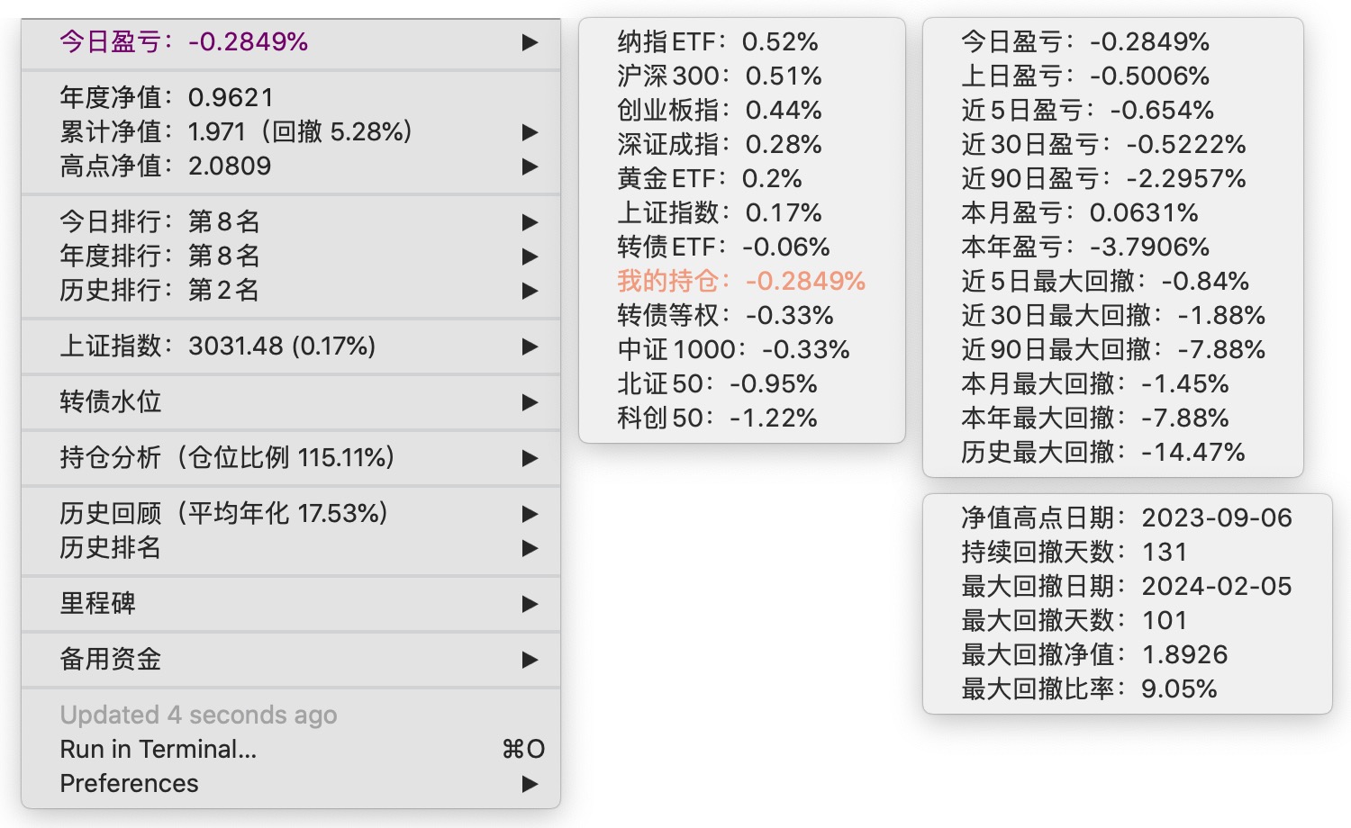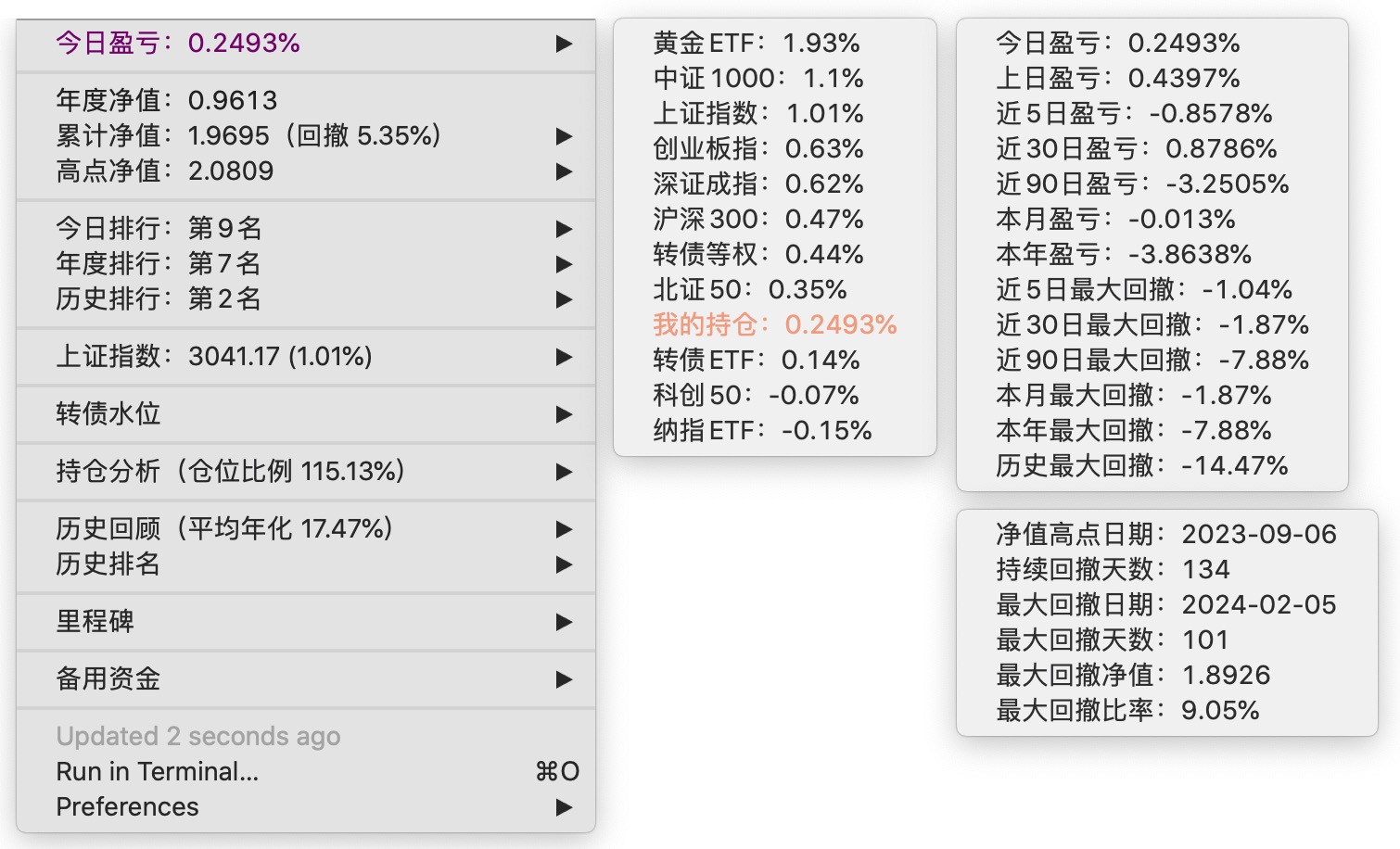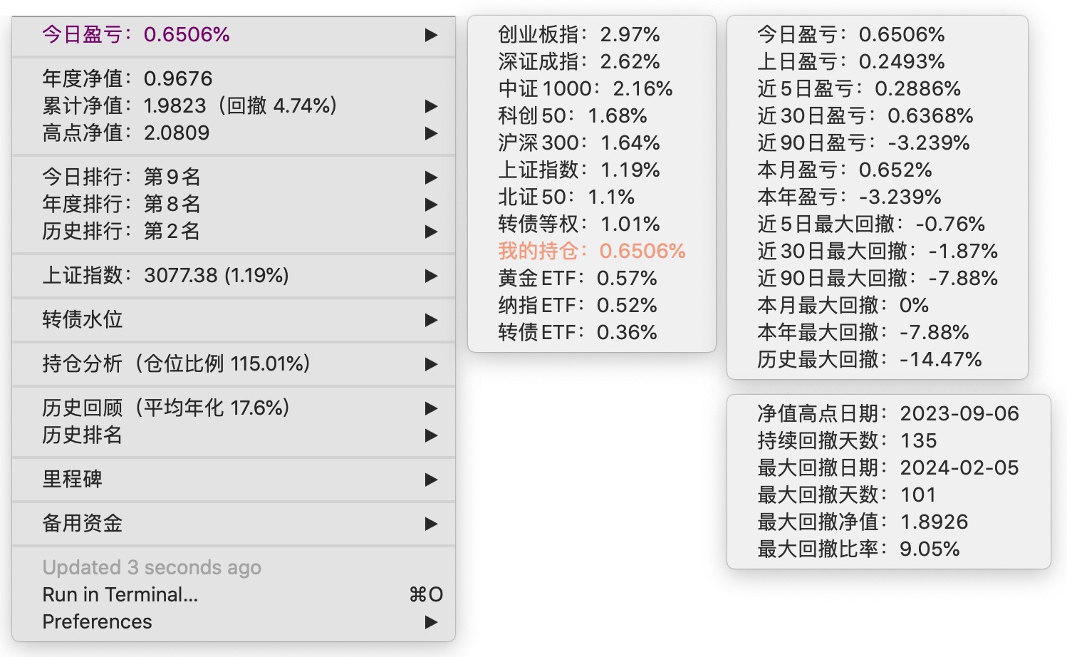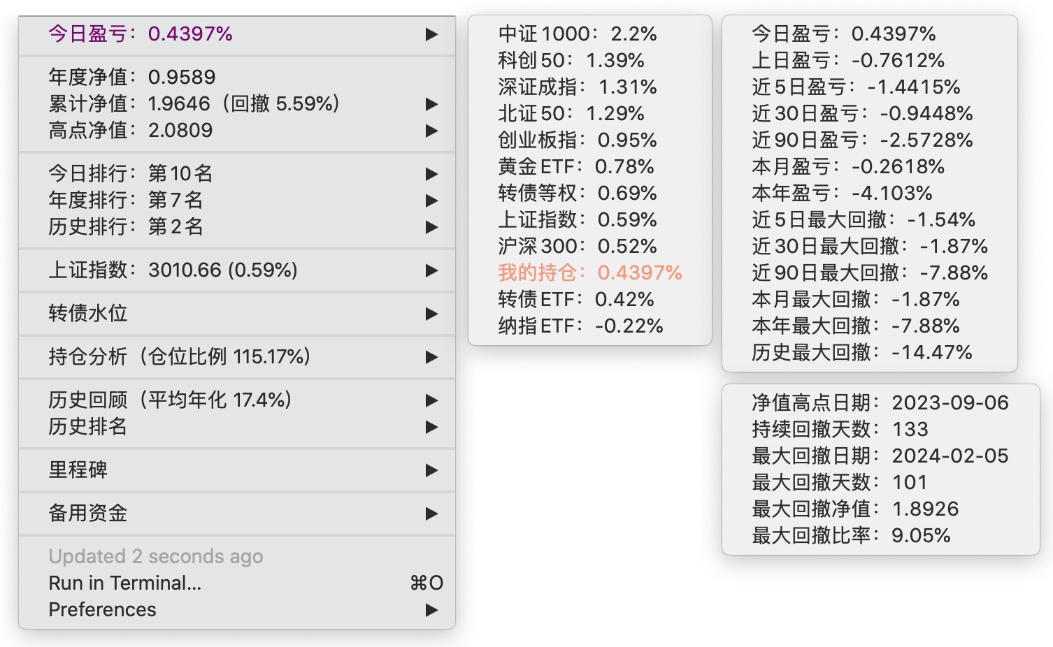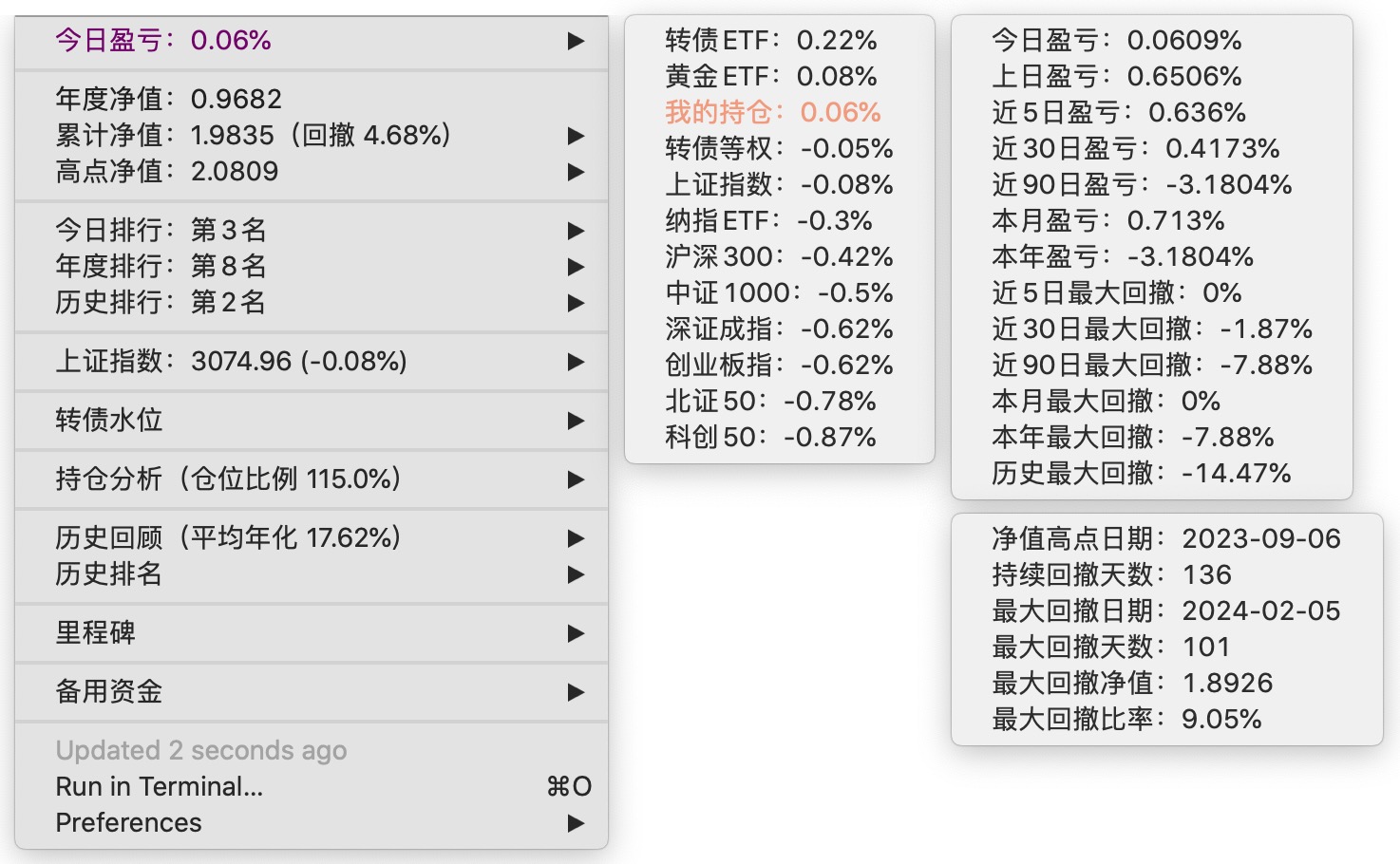 今日涨幅:0.2421%净值数据:1.0016(本年度),2.052(累计),高点回撤 -1.39%持仓数据:平均价格 108.1,平均溢价 75.4%,持仓数量:158市场数据:平均价格 121.636,平均溢价 65.6%,中位数价格 115.998(59.6%)市场成交:897亿清仓:富瀚(117.7)250张;减仓:英力(169.549)50张;建仓:富瀚(109.042)250张;加仓...楼主打地鼠的水平很高,是怎么做到的。