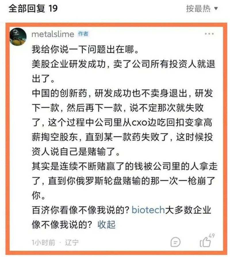 当苍蝇一只只出现的时候,行业应该是出问题了,虽然艰难,但百济仓位过高的风险也要考虑了,某球医药大V对创新药行业的观点,仅供参考,感觉跟恒大万科差不多的玩法。这大V怕是假的吧。这逻辑明显有问题啊,违反客观事实。从整个创新药大盘看,无论国内外,都有源源不断的投资在这个赛道上,否则哪来的新药入市呢?每份资金都可以在某个时间点退出,然后再另一个时间点再次进入。
