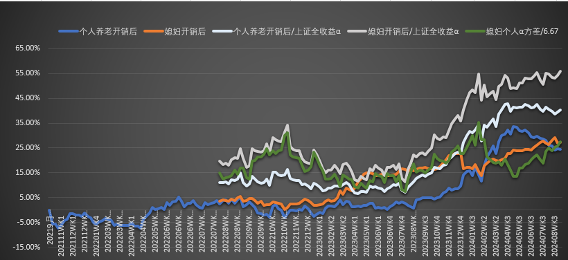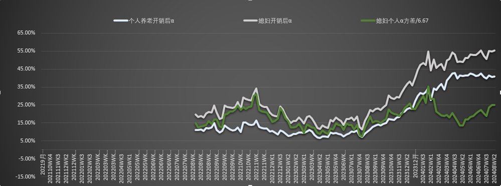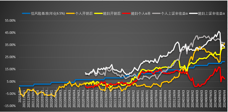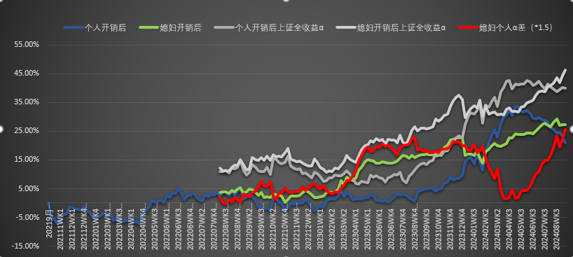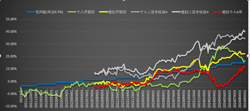 个人高位回撤-9.4%,媳妇高位回撤-2.7%,整体仓位19%,年度收益率+15.9%,目前媳妇相对个人以及上证全收益的α已经到了相对高位,按经验反弹不远了,本周我已经不敢乱搞了,跟着媳妇建仓小市值,预计相关仓位不超过一成。