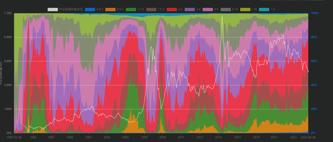1、还是引用历史PB/PE各分段占比数据,这次换个角度解读,目前PE为负占比和09年一致,为近30年最高,但PE小于40占比还是不够高,反映出企业盈利恶化情况历史极值,但优质公司估值已然不低;PB为负以及+pb大于6占比之和05、08年一致,已经大于12、18年,表明虽然pb很低,但ROE恶化。
