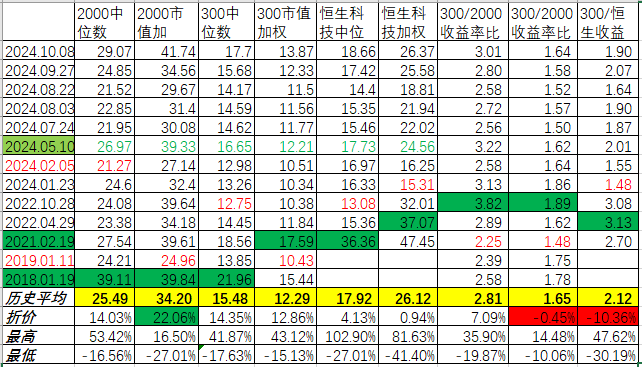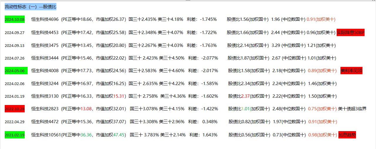 九月份后美长债经历了降息-加息的预期变化,现在市场共识美长债仍然会较长时间维持在4%以上的利率水平,那么再往前看就很清楚了,10.8日这天恒生科技(股债比当日小于1)和HS300(股债比当日小于2)的估值已经达到中美长债利倒挂差值大于1.5%后估值体系的阶段性高点。