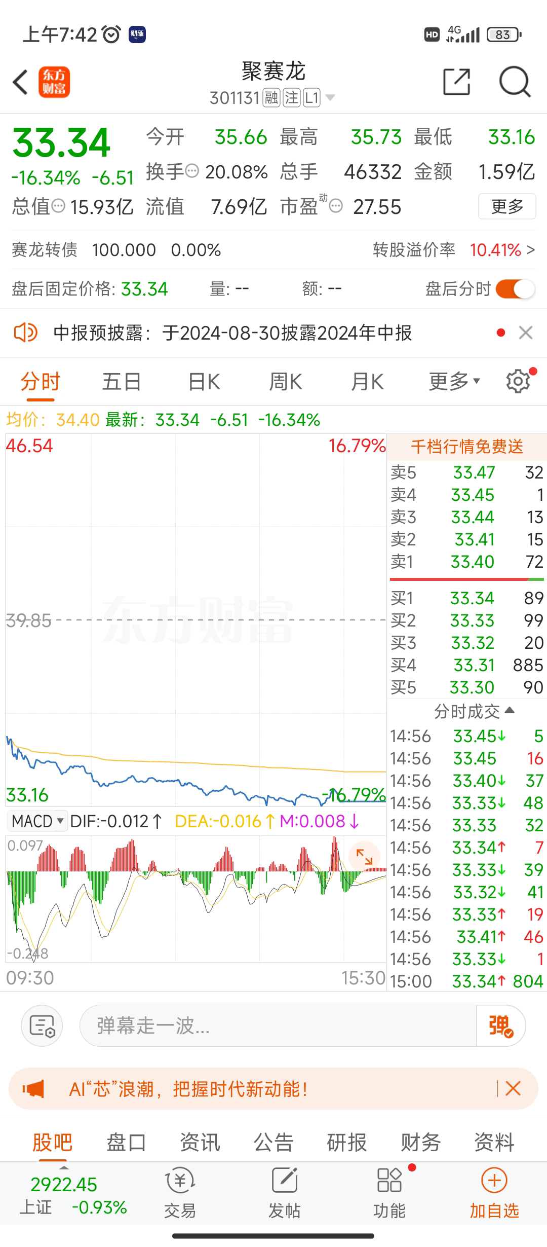 昨天买了500股严牌股票,30%的深市含权量,配债日涨幅不大,被上一只赛聚龙吓破胆了,今天跌幅大于百分之五的可能性较小。姑且记录