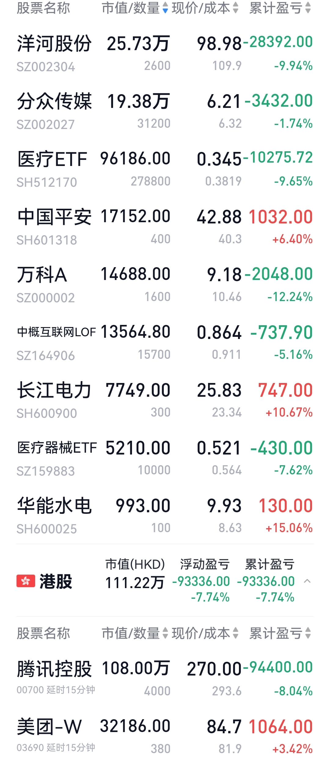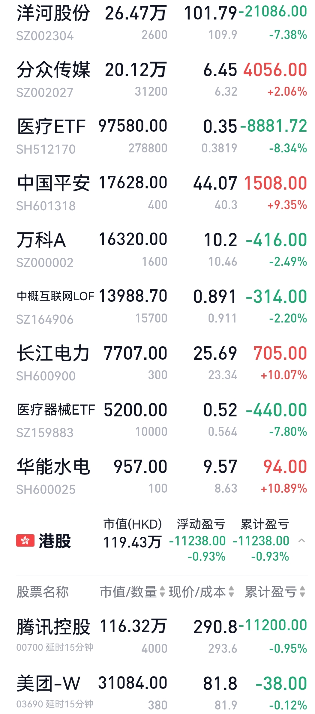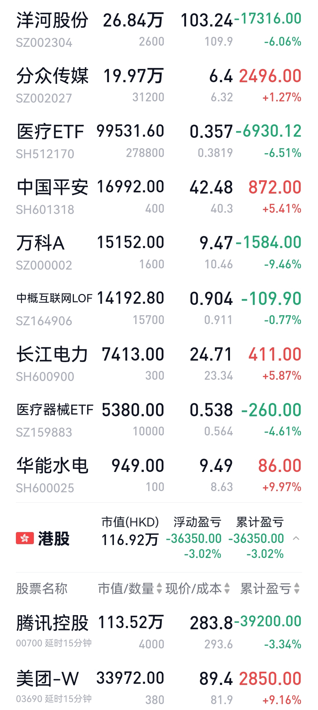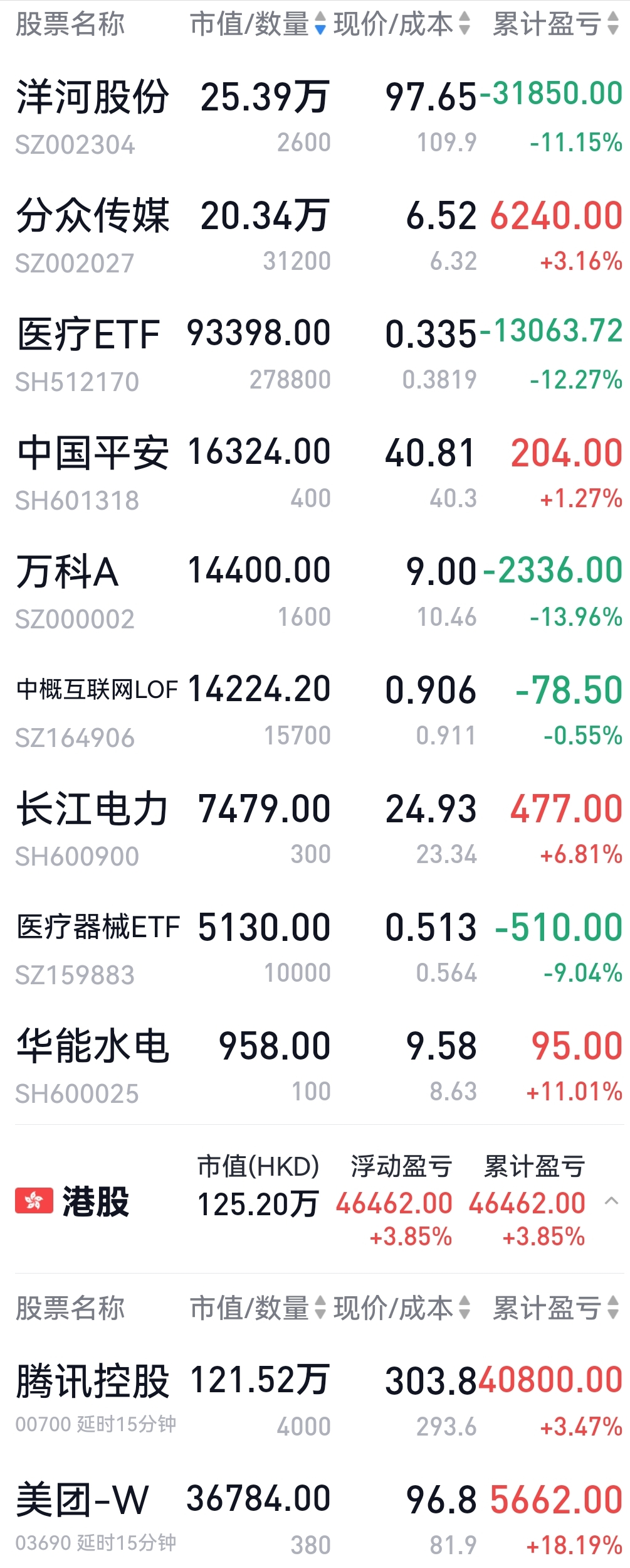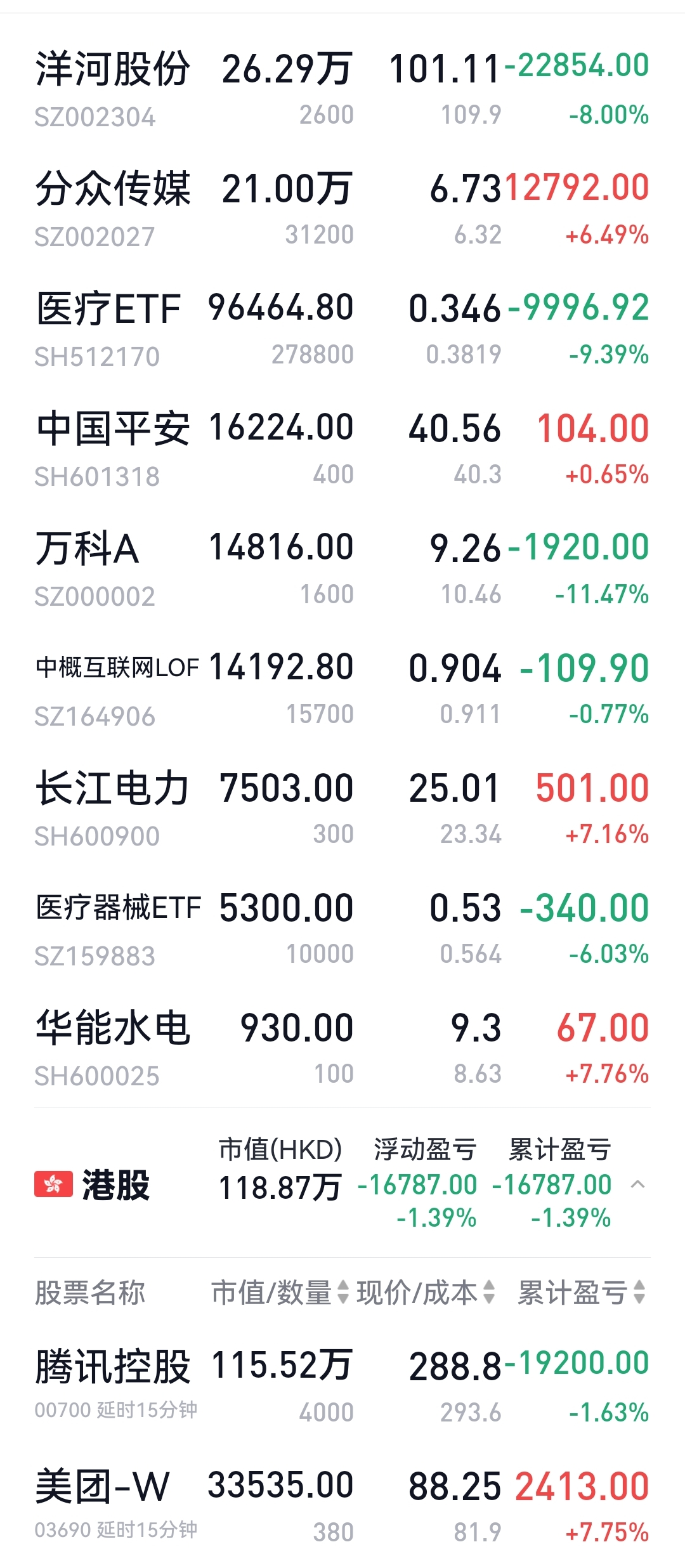 持仓列表少了很多。原来那些几百股的100股的都清掉了,感觉清爽了很多。万科信雅达是完全剔除自选,不再关注。长江电力,华能水电,新集,密切关注,等有合适的价格还会再买。