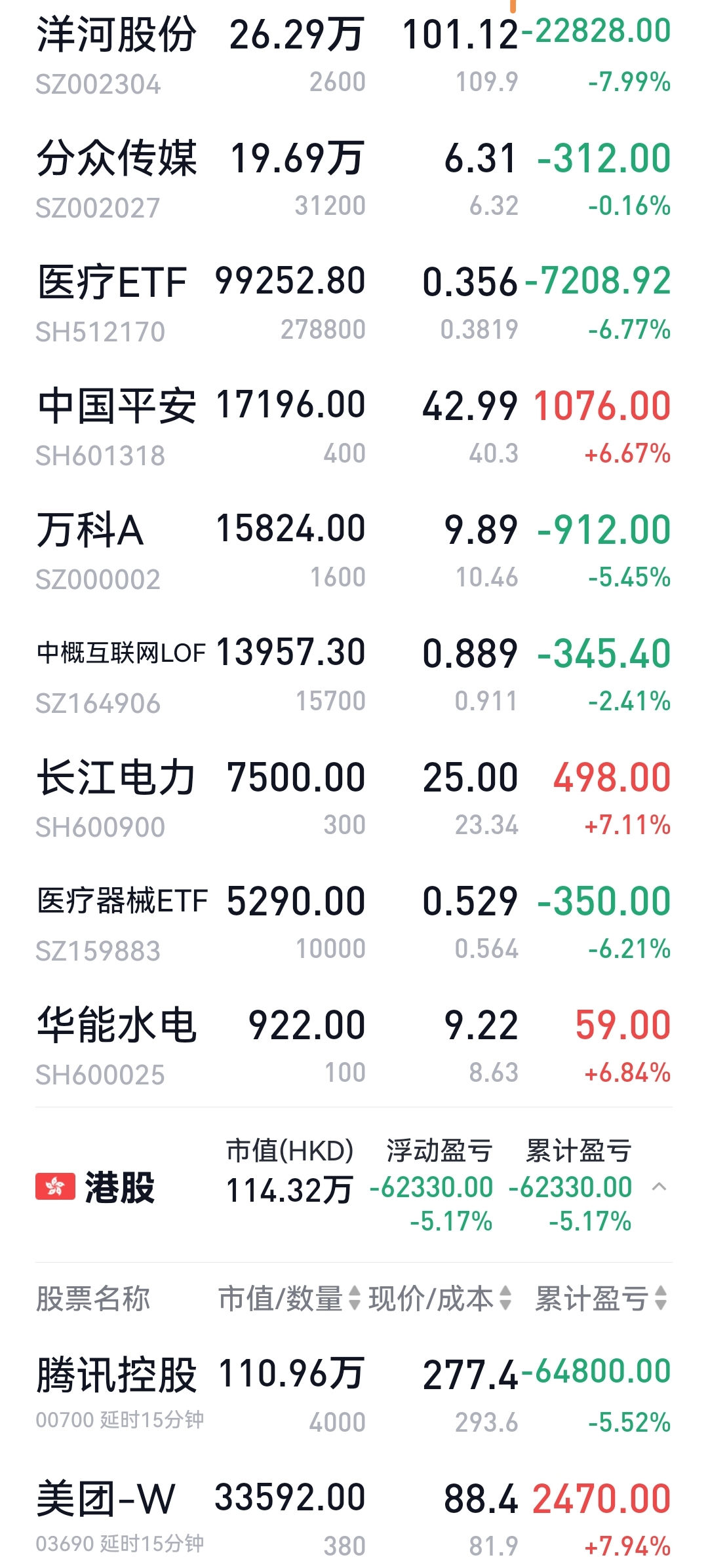 将账户里的几个极小仓位股票清仓了。信雅达亏损14%,万科亏损59%,长江电力盈利17%,新集盈利14%,华能水电盈利35%,这几个全清了,总体是大亏特亏,尤其是万科,亏了2万加,其他的就是赚几百亏几百,无伤大雅。万科算是割肉,认赔认输了。