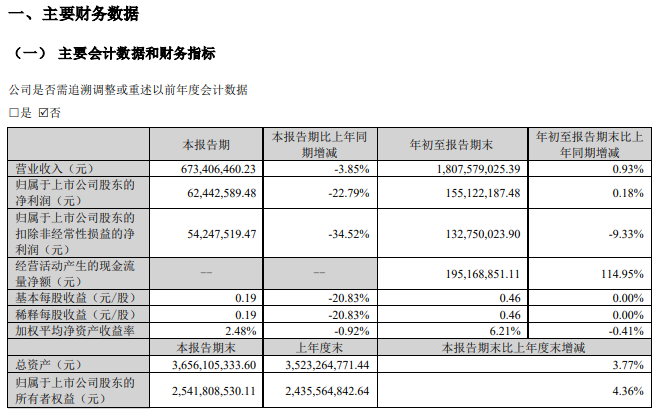 2023年第三季度公司营业收入同比增长0.93%,归属上市公司股东的净利润同比增长0.18%。