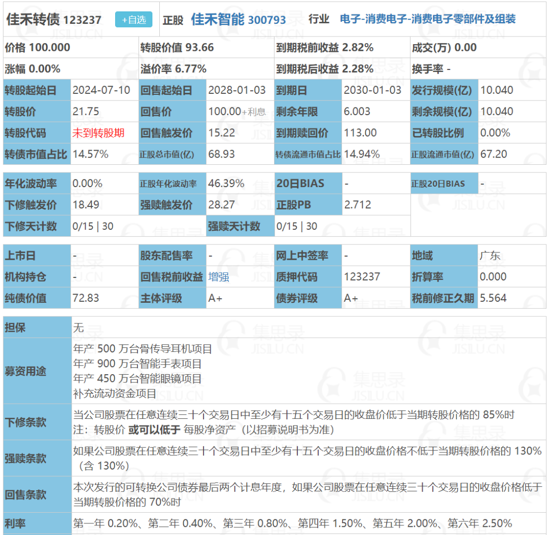 佳禾转债:(正股代码:300793,配债代码:380793)