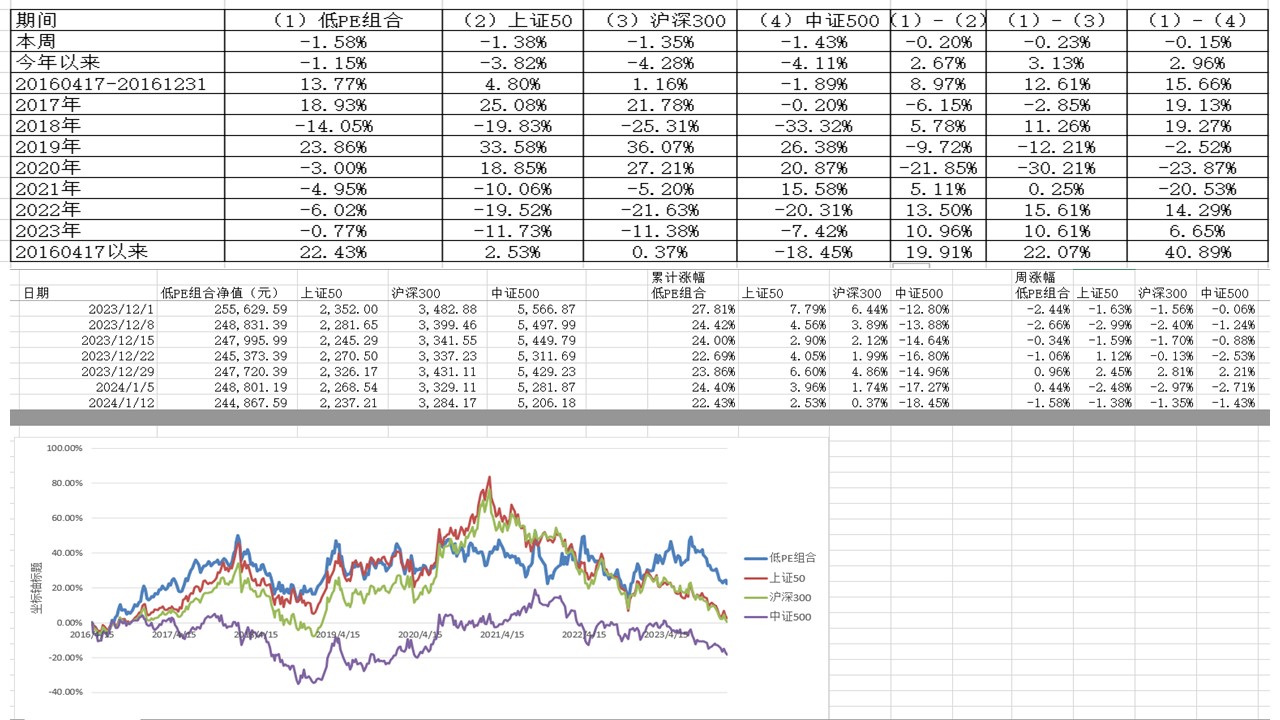 新年第一周,低估值模拟组合周收益率 0.44%,跑赢所有对标指数。少数几个股票及银行股贡献了正收益。