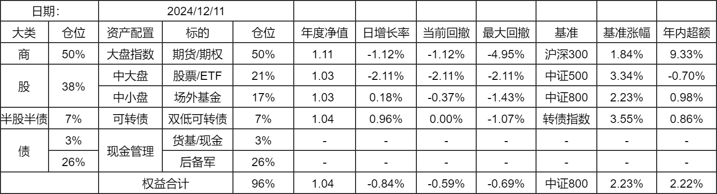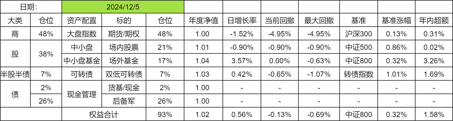 2、大类债主要是可转债,下跌了4.69%,相对等权转债超额-0.16%,跌的七荤八素,加仓的子弹让人因接不暇,同时期权需要准备补保证金,两者对比有个优先级;