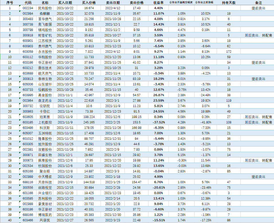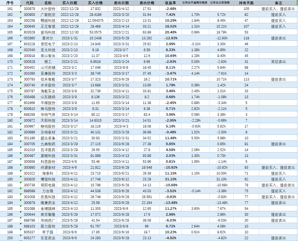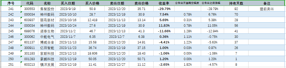 两年来共完成交易251笔,胜率62.5%,每笔持仓约占总资金的8~10%,平均每笔收益率3.18%,其中公告日开盘平均高开1.68%,公告日之前持仓的平均收益率1.5%。可见套利与提前埋伏贡献的收益大致相当。