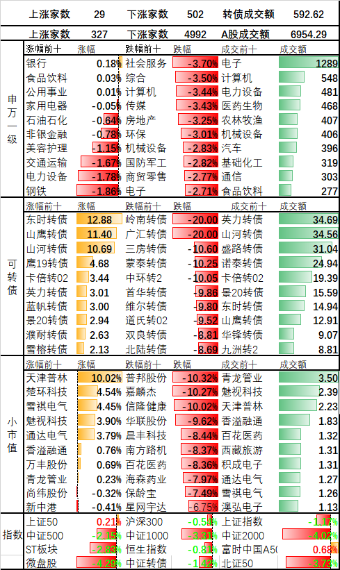 早盘我的账户也先清仓了,算了下总账,从我2021年进来玩,目前整体亏了4到5个点左右,今年的回撤有点大了,把去年的盈利都吐了。我的预期肯定是赚钱而不是亏钱,但是结果也只能接受,这几年如果去做生意,投项目或者做一些其他事情,结局大概率会更惨。这2年我主要也是抄各位大佬的作业,然后自己去逆向学习,目前暂时可以做到独立去做可转债了,但是我判断不了转债的未来,能看到的就是22年8月新规,转债等权指数是一路下行的,能做出超额也全是靠轮动的收益。封基老师、资水老师是我关注比较多的两位老师,受益匪浅,在我的投资体系包括成绩出来之前,我也主要是靠参考各位老师的判断做投资,认清楚自己这点很重要。我的资金和时间各方面条件都允许的情况下,投资我也会进行到底,虽然资质平平。如果投资需要掌握十八般武艺,我最多也是只会可转债这把刷子而已,需要学的还很多,前路漫漫呀。