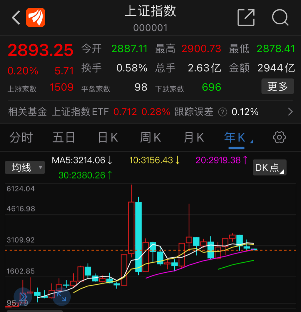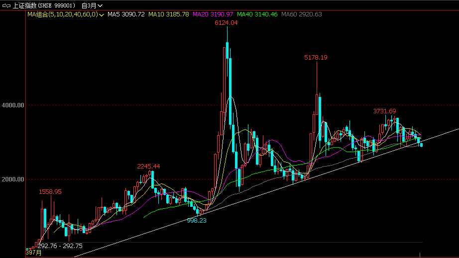 2923-2855附近这一段,按照画线原理的不同,就是整个上证指数最长时间周期的长期均线,有个朋友说过一句老话: