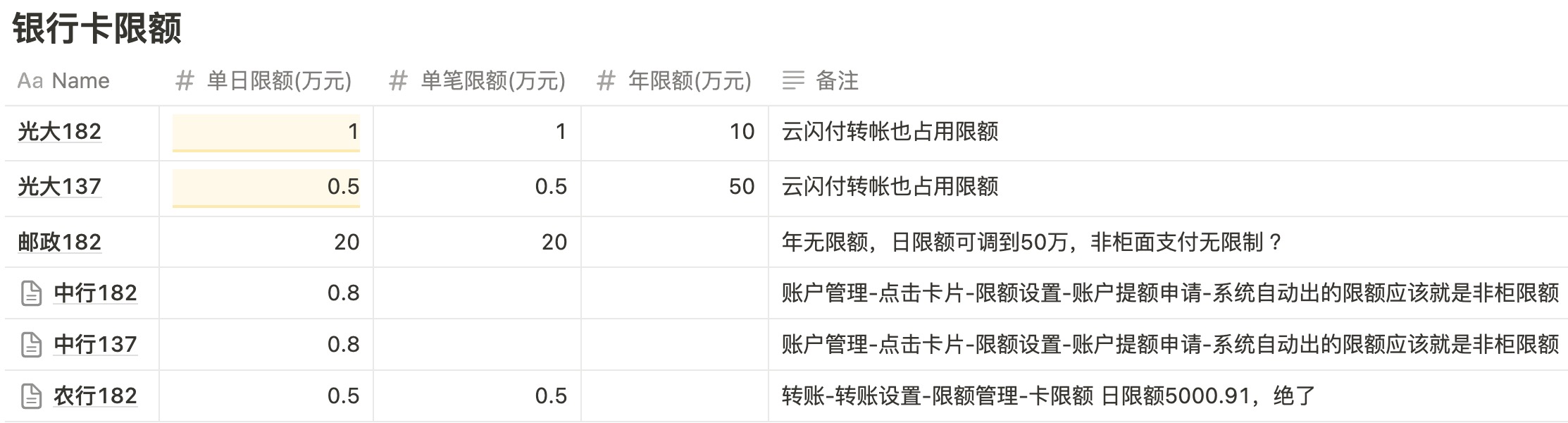 最近在整理手里的银行卡限额,基本单日、单笔5k-1w。当然比较常用的比较大的招商和平安不在图上。