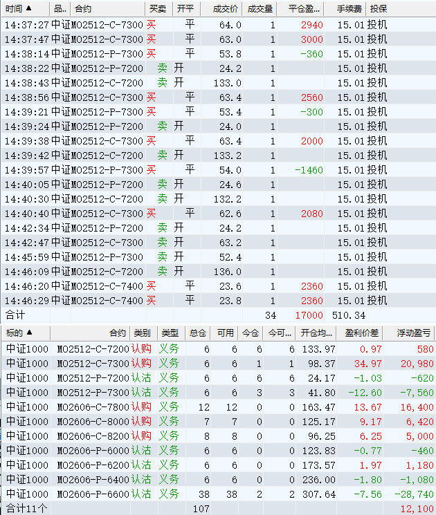 日盈利额=(147240.80逐笔浮盈) + (49420.00平仓盈亏) - (915.61手续费) - (154080.90昨天逐浮盈) = 41664.29日收益 = 0.99%周收益 = 6.29%年收益 = 37.51%年超额中证1000 = 14.41%MO2512超额中证1000 = 2.52%年内最大回撤 = -52.21%最新回撤 = -1.81%Delta合计 = -4.24...牛逼