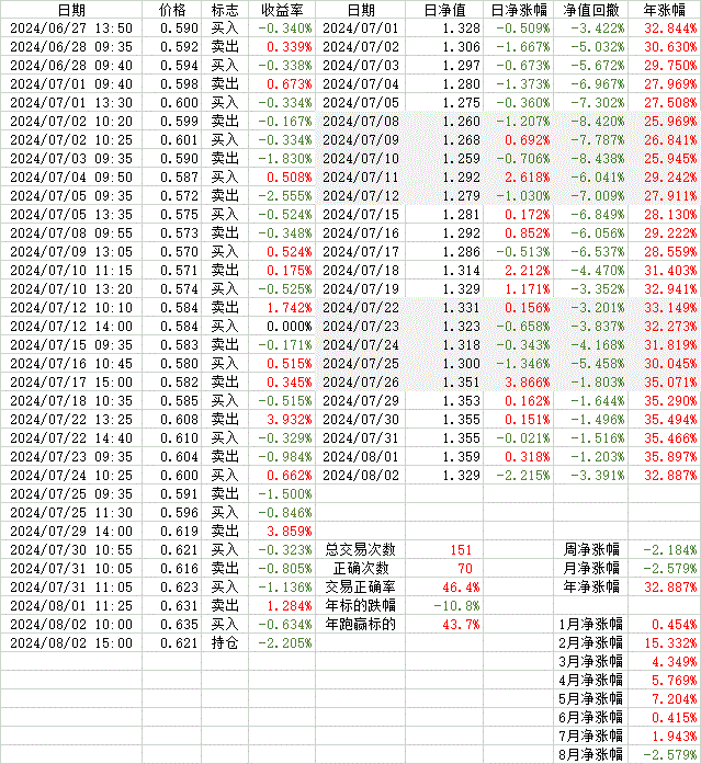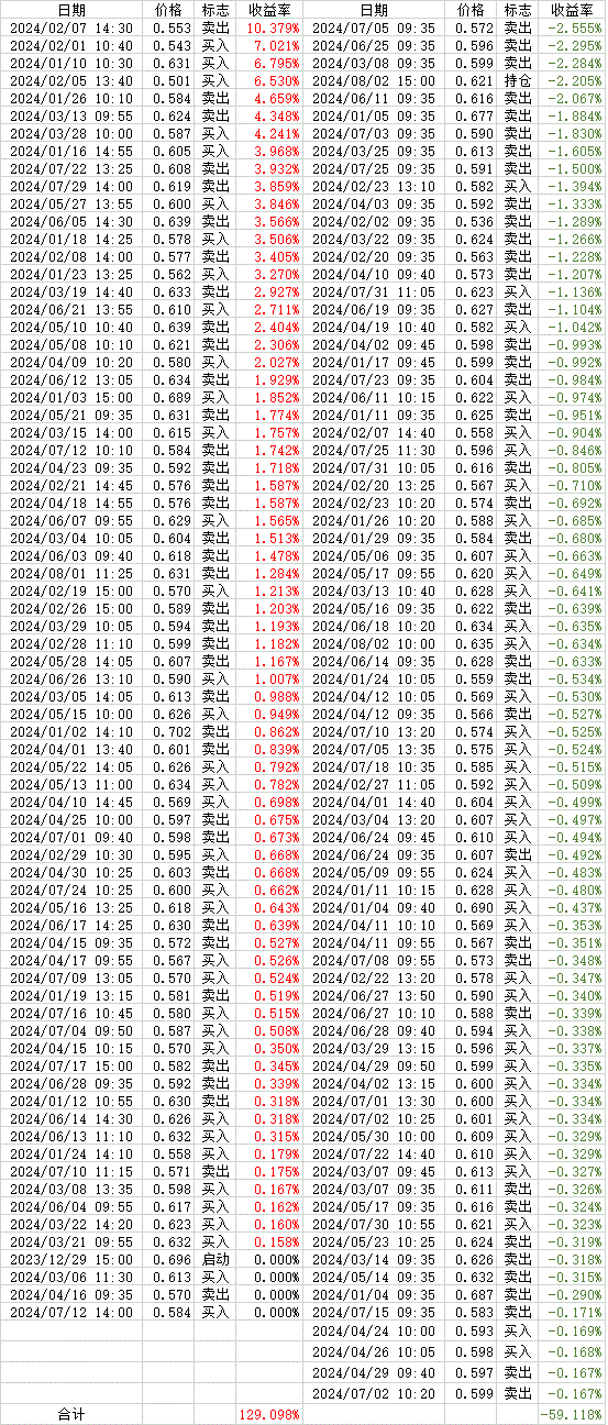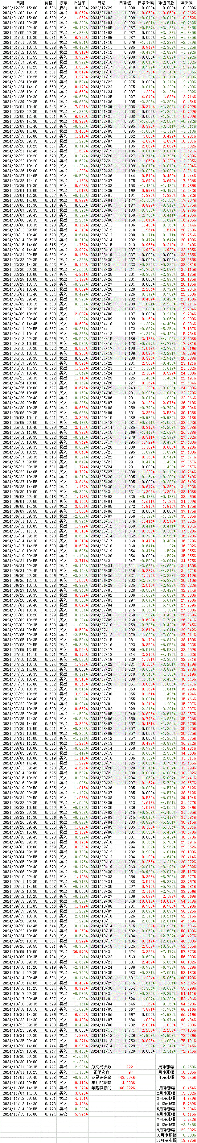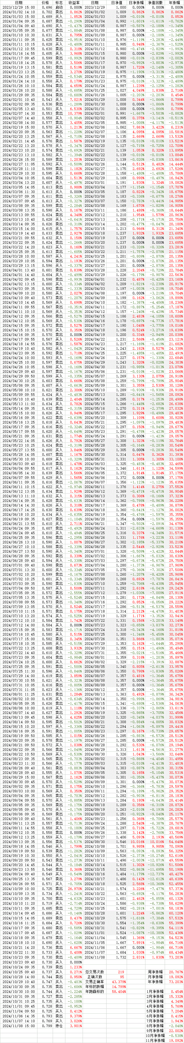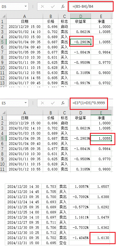 我把2024年的交易时点及交易价格用文本方式给出,你可以复制粘贴到Excel验证净值,我贴出的交易时点和价格可以用大智慧或通达信软件切换到5分钟K下人工验证。